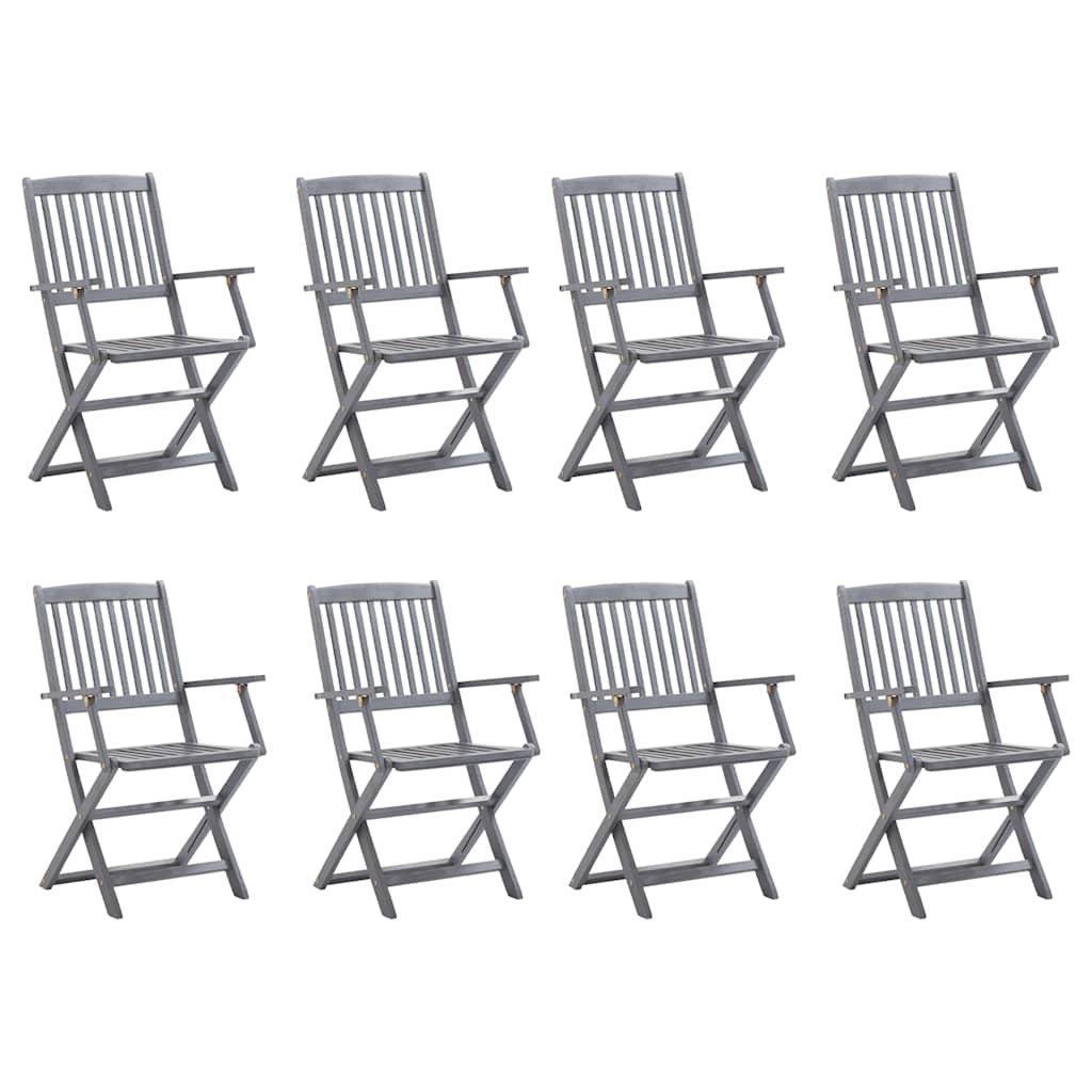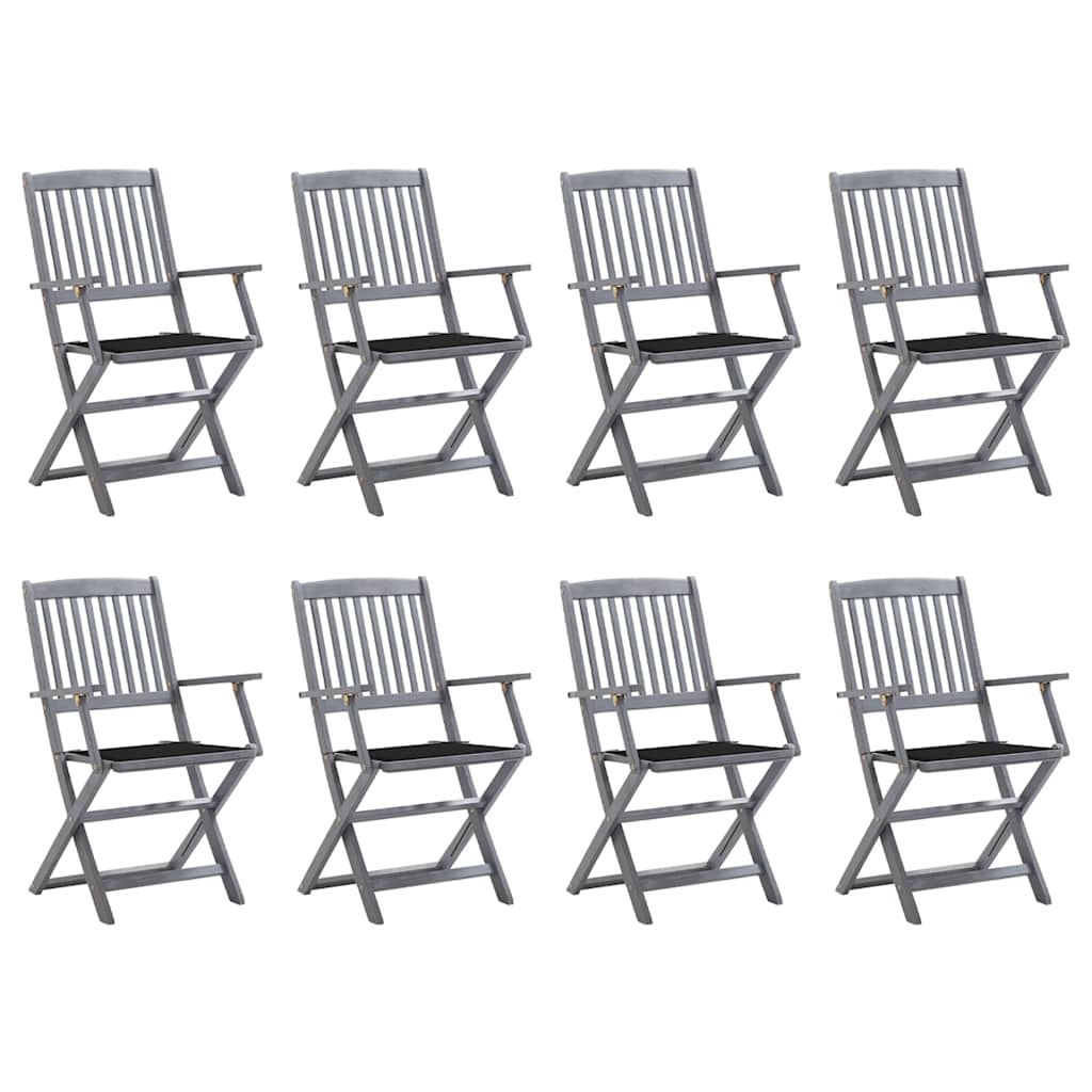 Dieses moderne Set aus Holz-Gartenstühlen mit Sitzpolstern verleiht Ihrem Garten, Ihrer Terrasse oder Ihrem Hof einen Hauch von natürlichem Stil und ist außerdem eine ausgezeichnete Wahl für Mahlzeiten im Freien. Diese Essstühle bestehen aus massivem Akazienholz, einem tropischen Hartholz, was die Stühle witterungsbeständig macht und eine jahrelange Lebensdauer gewährleistet, da massives Akazienholz sowohl belastbar als auch verschleißfest ist. Die grau lasierte Oberfläche ist ganz einfach mit einem feuchten Tuch zu reinigen. Bei Nichtgebrauch lassen sich die Stühle platzsparend zusammenklappen. Darüber hinaus bieten die mitgelieferten Sitzkissen zusätzlichen Komfort beim Entspannen oder Speisen. Zur sicheren Befestigung am Stuhl ist jedes Sitzpolster mit je zwei Bindebändern an zwei Ecken versehen. Hinweis: Um die Lebensdauer Ihrer Gartenmöbel zu verlängern, empfehlen wir Ihnen, diese regelmäßig zu reinigen und im Freien vor Niederschlägen oder starken Sonnenstrahlen zu schützen.Reinigung: Verwenden Sie eine milde SeifenlösungLagerung: Wenn möglich, an einem kühlen, trockenen Ort im Innenbereich lagern. Wenn das Produkt im Freien gelagert wird, schützen Sie es mit einer wasserdichten Abdeckung. Wischen und trocknen Sie das überschüssige Wasser oder den Schnee nach Regen oder Schneefall von ebenen Flächen. Sorgen Sie für eine ausreichende Luftzirkulation, um feuchtigkeitsbedingte Schäden zu vermeiden.