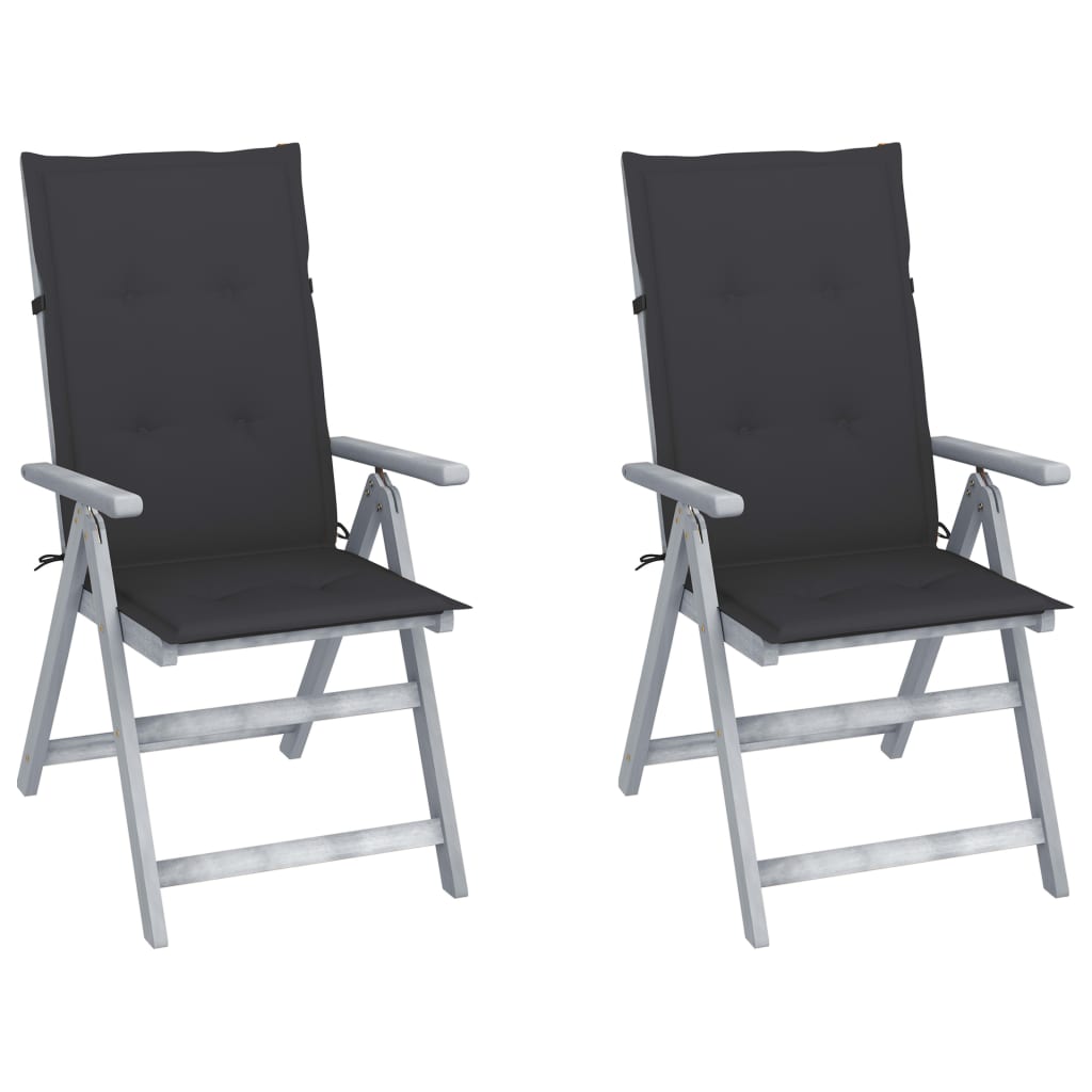 Diese trendigen Outdoor-Stühle erhöhen deinen Komfort im Outdoor-Bereich! Diese Stühle bestehen aus massivem Akazienholz, einem Hartholz mit dichter Maserung, das mit einer grauer Lackierung versehen wurde. Daher sind diese wunderschön gestalteten Outdoor-Stühle besonders stabil, langlebig und auffällig. Die Rückenlehnen der Stühle lassen sich in 5 Positionen einstellen, sodass Sie stets die bequemste Position finden können. Darüber hinaus bieten die mitgelieferten Auflagen zusätzlichen Komfort beim Entspannen. Sie bestehen aus 100 % Polyester, das wasserdicht behandelt wurde. Jede Auflage verfügt über ein Gummiband und je zwei Bänder an zwei Ecken zur festen Befestigung am Stuhl. Diese Holzstühle eignen sich perfekt, um mit Ihrer Familie zu speisen oder einfach nur das Wetter in Ihrem Garten zu genießen.