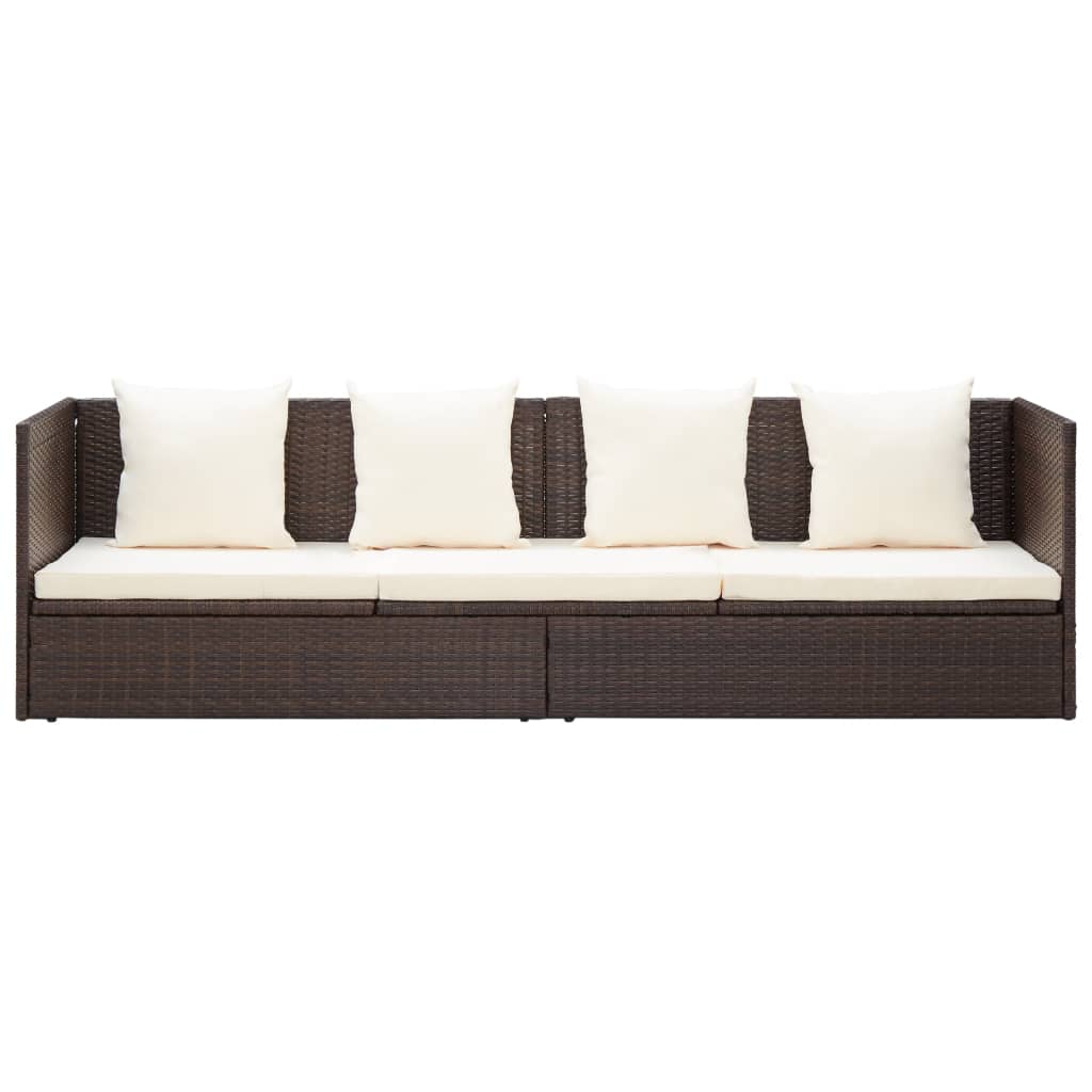Dieses Garten-Schlafsofa aus Polyrattan ist ein idealer Rückzugsort, um sich zu entspannen und Ihre Freizeit in der Nähe des Pools, im Garten, auf der Terrasse usw. zu genießen. Die Sonnenliege ist von einem pulverbeschichteten Stahlrahmen getragen, der mit wetterfestem und pflegeleichtem PE-Rattan umflochten ist. Das extra dicke Sitzpolster und die Kissen sorgen für optimalen Komfort. Der Bezug des Sitzkissens ist mit Reißverschluss versehen, so dass er abgenommen und gewaschen werden kann. Außerdem kann das Sofabett von beiden Seiten in 7 verschiedene Positionen verstellt werden, um zusätzliche Sitzgelegenheiten oder eine bequemere Sitzposition zum Entspannen zu schaffen. Hinweis: Wir empfehlen, das Set bei Regen, Schnee und Frost für eine lange Lebensdauer abzudecken.