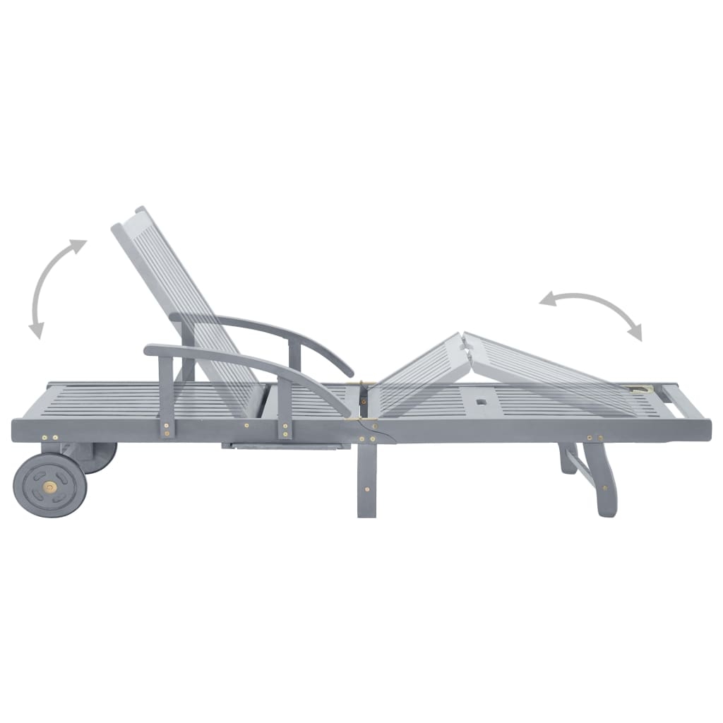Entspannen und erholen Sie sich in Ihrem Garten oder Ihrer Terrasse auf dieser bequemen Sonnenliege aus Holz! Verbringen Sie einen entspannten Nachmittag in Ihrem eigenen Outdoor-Wohnbereich. Die Relaxliege ist perfekt für den Balkon, Garten, Pool usw. Diese Garten-Sonnenliege besteht aus massivem Akazienholz mit grauem Finish und ist daher robust und stabil. Die Rückenlehne und die Fußstütze sind verstellbar, und außerdem können Sie die Liege in der gewünschten Position arretieren. Diese Garten-Sonnenliege kann dank der 2 Räder leicht umstellt werden. Die Sonnenliege verfügt über eine praktische ausziehbare Ablage, auf der Sie Ihr Telefon, Ihre Sonnenbrille, Getränke und andere kleine Gegenstände aufbewahren können. Das Kissen bietet zusätzlichen Komfort beim Entspannen. Jede Auflage verfügt über zwei Sets Bänder, mit denen sie sicher auf der Sonnenliege befestigt werden kann. HinweisUm die Lebensdauer Ihrer Gartenmöbel zu verlängern, empfehlen wir Ihnen, diese regelmäßig zu reinigen und bei Nichtgebrauch, wenn im Freien, abzudecken.Reinigung:Verwenden Sie eine milde SeifenlösungLagerung:Wenn möglich, an einem kühlen, trockenen Ort im Innenbereich lagern. Wenn das Produkt im Freien gelagert wird, schützen Sie es mit einer wasserdichten Abdeckung. Wischen und trocknen Sie das überschüssige Wasser oder den Schnee, nach Regen oder Schneefall. Sorgen Sie für eine ausreichende Luftzirkulation, um feuchtigkeitsbedingte Schäden zu vermeiden.