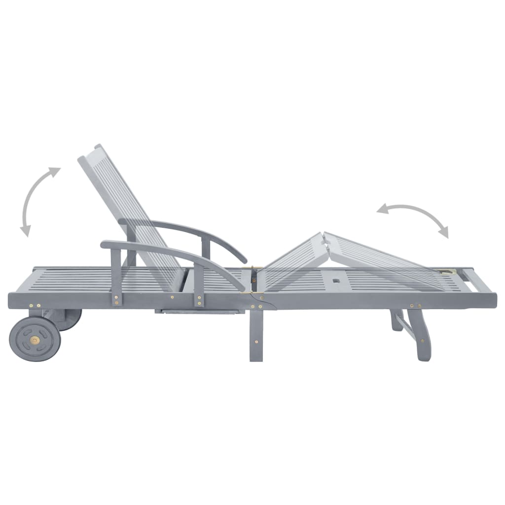 Entspannen und erholen Sie sich in Ihrem Garten oder Ihrer Terrasse auf dieser bequemen Sonnenliege aus Holz! Verbringen Sie einen entspannten Nachmittag in Ihrem eigenen Outdoor-Wohnbereich. Die Relaxliege ist perfekt für den Balkon, Garten, Pool usw. Diese Garten-Sonnenliege besteht aus massivem Akazienholz mit grauem Finish und ist daher robust und stabil. Die Rückenlehne und die Fußstütze sind verstellbar, und außerdem können Sie die Liege in der gewünschten Position arretieren. Diese Garten-Sonnenliege kann dank der 2 Räder leicht umstellt werden. Die Sonnenliege verfügt über eine praktische ausziehbare Ablage, auf der Sie Ihr Telefon, Ihre Sonnenbrille, Getränke und andere kleine Gegenstände aufbewahren können. Das Kissen bietet zusätzlichen Komfort beim Entspannen. Jede Auflage verfügt über zwei Sets Bänder, mit denen sie sicher auf der Sonnenliege befestigt werden kann. HinweisUm die Lebensdauer Ihrer Gartenmöbel zu verlängern, empfehlen wir Ihnen, diese regelmäßig zu reinigen und bei Nichtgebrauch, wenn im Freien, abzudecken.Reinigung:Verwenden Sie eine milde SeifenlösungLagerung:Wenn möglich, an einem kühlen, trockenen Ort im Innenbereich lagern. Wenn das Produkt im Freien gelagert wird, schützen Sie es mit einer wasserdichten Abdeckung. Wischen und trocknen Sie das überschüssige Wasser oder den Schnee, nach Regen oder Schneefall. Sorgen Sie für eine ausreichende Luftzirkulation, um feuchtigkeitsbedingte Schäden zu vermeiden.