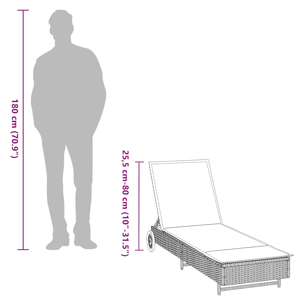 Diese Sonnenliege mit Rädern eignet sich ideal zum Entspannen am Pool, auf dem Balkon oder auf dem Campingplatz, sei es am Wochenende oder gar im Urlaub. Langlebiges Material: PE-Rattan, auch als Poly Rattan bekannt, ist ein robustes, pflegeleichtes synthetisches Material, das die Optik von natürlichem Rattan aufweist. Es kennzeichnet sich durch ein geringes Eigengewicht und lässt sich einfach reinigen. Aufgrund seiner Haltbarkeit und Witterungsbeständigkeit wird es häufig bei der Herstellung von Gartenmöbeln verwendet.Verstellbare Rückenlehne: Dieses Möbelstück verfügt über eine 3-fach verstellbare Rückenlehne, um stets die bequemste Position zum Entspannen zu finden.Einfacher Transport: Dank der 2 Räder lassen sich die Sonnenliegen mühelos umher verschieben.Bequemes Sitzerlebnis: Dank des dick gepolsterten Kissens bietet dieser Gartenhocker höchsten Sitzkomfort.Abnehmbarer und waschbarer Bezug: Das Sitzkissen verfügt über einen abnehmbaren Bezug, der sich ganz einfach waschen und pflegen lässt. Gut zu wissen:Wir empfehlen dir, deine Gartenmöbel mit einer wasserdichten Hülle zu schützen, um lange Zeit eine ansprechende Optik aufzuweisen.