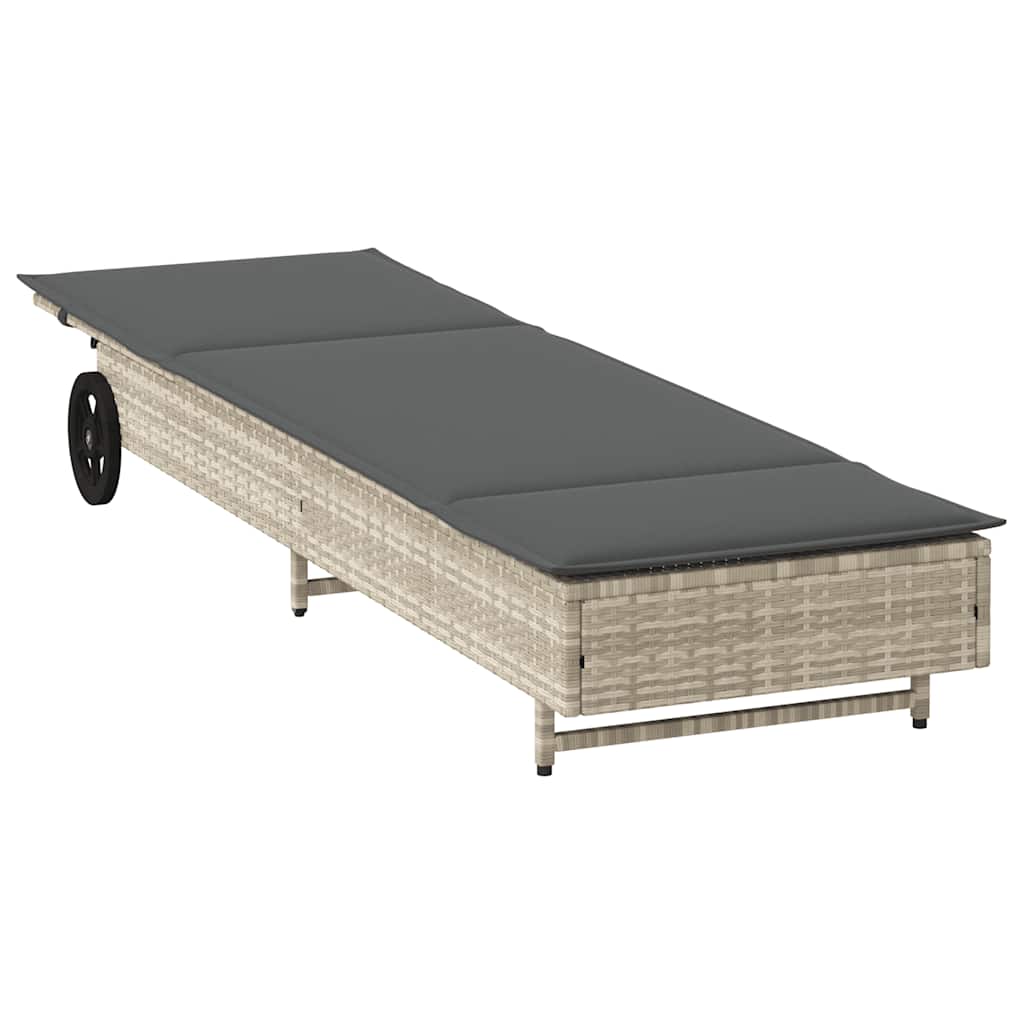 Diese Sonnenliege mit Rädern eignet sich ideal zum Entspannen am Pool, auf dem Balkon oder auf dem Campingplatz, sei es am Wochenende oder gar im Urlaub. Langlebiges Material: PE-Rattan, auch als Poly Rattan bekannt, ist ein robustes, pflegeleichtes synthetisches Material, das die Optik von natürlichem Rattan aufweist. Es kennzeichnet sich durch ein geringes Eigengewicht und lässt sich einfach reinigen. Aufgrund seiner Haltbarkeit und Witterungsbeständigkeit wird es häufig bei der Herstellung von Gartenmöbeln verwendet.Verstellbare Rückenlehne: Dieses Möbelstück verfügt über eine 3-fach verstellbare Rückenlehne, um stets die bequemste Position zum Entspannen zu finden.Einfacher Transport: Dank der 2 Räder lassen sich die Sonnenliegen mühelos umher verschieben.Bequemes Sitzerlebnis: Dank des dick gepolsterten Kissens bietet dieser Gartenhocker höchsten Sitzkomfort.Abnehmbarer und waschbarer Bezug: Das Sitzkissen verfügt über einen abnehmbaren Bezug, der sich ganz einfach waschen und pflegen lässt. Gut zu wissen:Wir empfehlen dir, deine Gartenmöbel mit einer wasserdichten Hülle zu schützen, um lange Zeit eine ansprechende Optik aufzuweisen.
