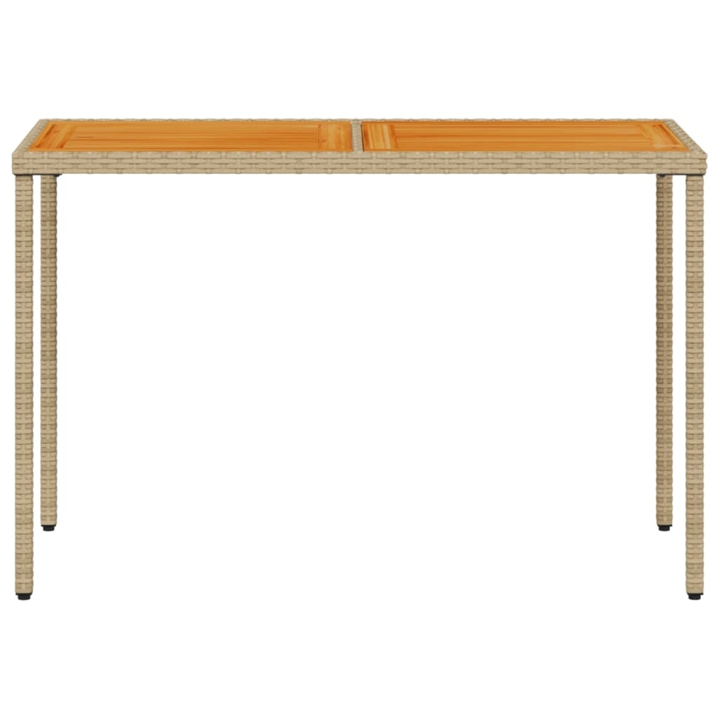 Mit seinen klaren Linien und seinem schlichten Design ist dieser Gartentisch mit Holzplatte eine ausgezeichnete Wahl für deinen Garten, deine Terrasse und andere Außenbereiche. Langlebiges Material: PE-Rattan, auch als Poly Rattan bekannt, ist ein robustes, pflegeleichtes synthetisches Material, das die Optik von natürlichem Rattan aufweist. Es kennzeichnet sich durch ein geringes Eigengewicht und lässt sich einfach reinigen. Aufgrund seiner Haltbarkeit und Witterungsbeständigkeit wird es häufig bei der Herstellung von Gartenmöbeln verwendet.Stabile und pflegeleichte Tischplatte: Dieser Gartentisch besitzt eine Tischplatte aus Akazienholz, die robust und langlebig ist und sich leicht mit einem feuchten Tuch reinigen lässt.Robuster und stabiler Rahmen: Dank des pulverbeschichteten Stahlrahmens ist das Möbelstück robust, stabil und für den täglichen Einsatz im Außenbereich geeignet. Gut zu wissen:Wir empfehlen dir, deine Gartenmöbel mit einer wasserdichten Hülle zu schützen, um lange Zeit eine ansprechende Optik aufzuweisen.