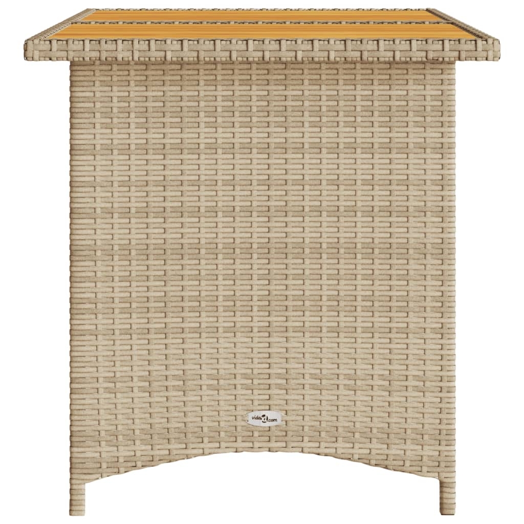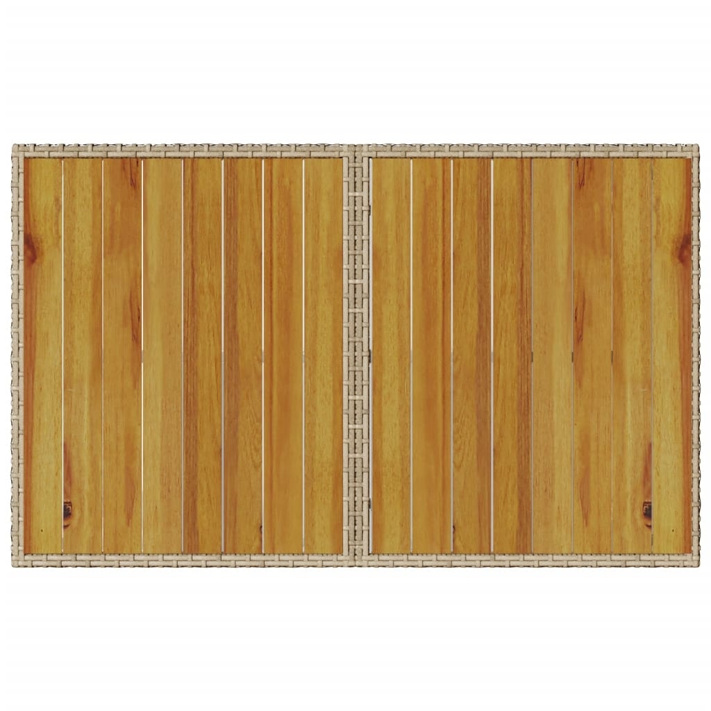 Mit seinen klaren Linien und seinem schlichten Design ist dieser Gartentisch mit Holzplatte eine ausgezeichnete Wahl für deinen Garten, deine Terrasse und andere Außenbereiche. Langlebiges Material: PE-Rattan, auch als Poly Rattan bekannt, ist ein robustes, pflegeleichtes synthetisches Material, das die Optik von natürlichem Rattan aufweist. Es kennzeichnet sich durch ein geringes Eigengewicht und lässt sich einfach reinigen. Aufgrund seiner Haltbarkeit und Witterungsbeständigkeit wird es häufig bei der Herstellung von Gartenmöbeln verwendet.Tischplatte aus Holz: Die Tischplatte des Gartentisches besteht aus robustem und langlebigem Akazienholz, sodass sie leicht mit einem feuchten Tuch gereinigt werden. Der Outdoor-Tisch verleiht deinem Außenbereich einen Hauch von Eleganz.Robuster und stabiler Rahmen: Dank des pulverbeschichteten Stahlrahmens ist das Outdoor-Möbel robust, stabil und für den täglichen Einsatz im Außenbereich geeignet. Gut zu wissen:Wir empfehlen dir, deine Gartenmöbel mit einer wasserdichten Hülle zu schützen, um lange Zeit eine ansprechende Optik aufzuweisen.