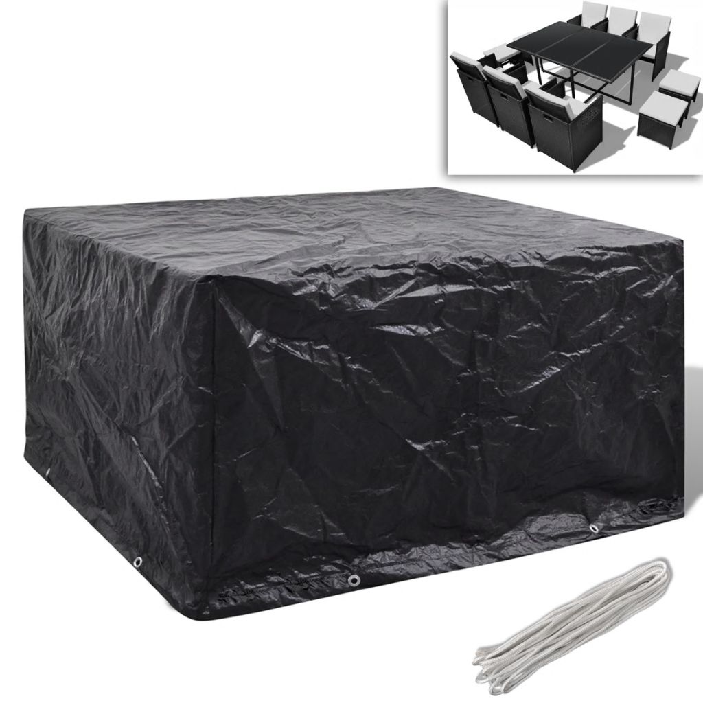 Diese hochwertige Gartenmöbel-Abdeckplane schützt deine Rattan-Gartenmöbel das ganze Jahr über vor Verschmutzungen, Wind, Regen und UV-Strahlung. Die Abdeckplane besteht aus strapazierfähigem Polyethylen, das wasserfest, UV-beständig, reißfest und somit für den täglichen Gebrauch geeignet ist. Die Plane ist mit 8 Aluminiumösen und einem Befestigungsseil ausgestattet und lässt sich daher fest anbringen. Die Hülle ist für unser 6-Personen-Möbel-Set (SKU 40923 / 40836) geeignet. Du kannst diese Abdeckung auch für andere Gartenmöbel-Sets verwenden, solange sie von der Größe her passt. Hinweis: Dieses Produkt ist nicht 100 % wasserdicht. Wir empfehlen daher, es mit einem Imprägnierspray zu behandeln.