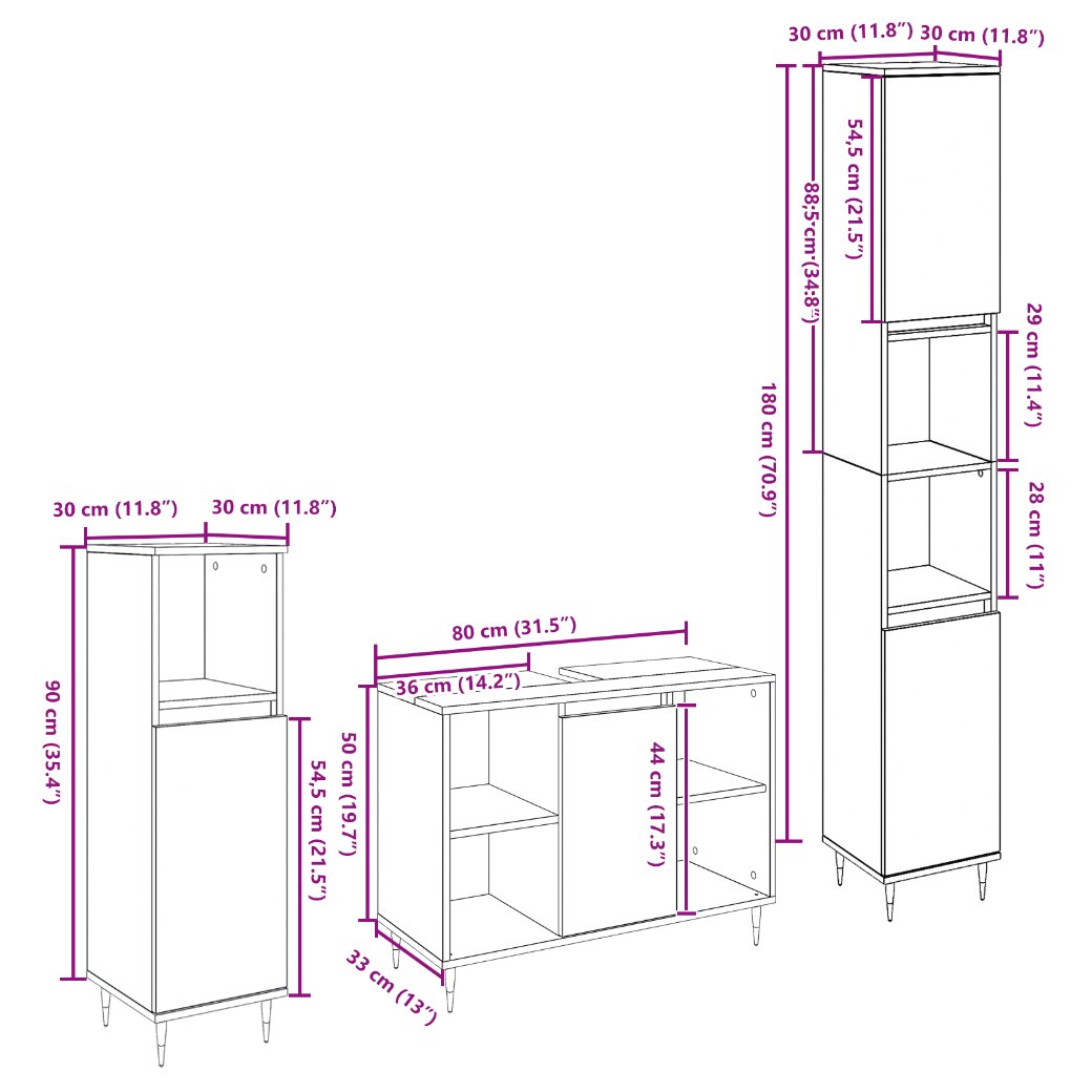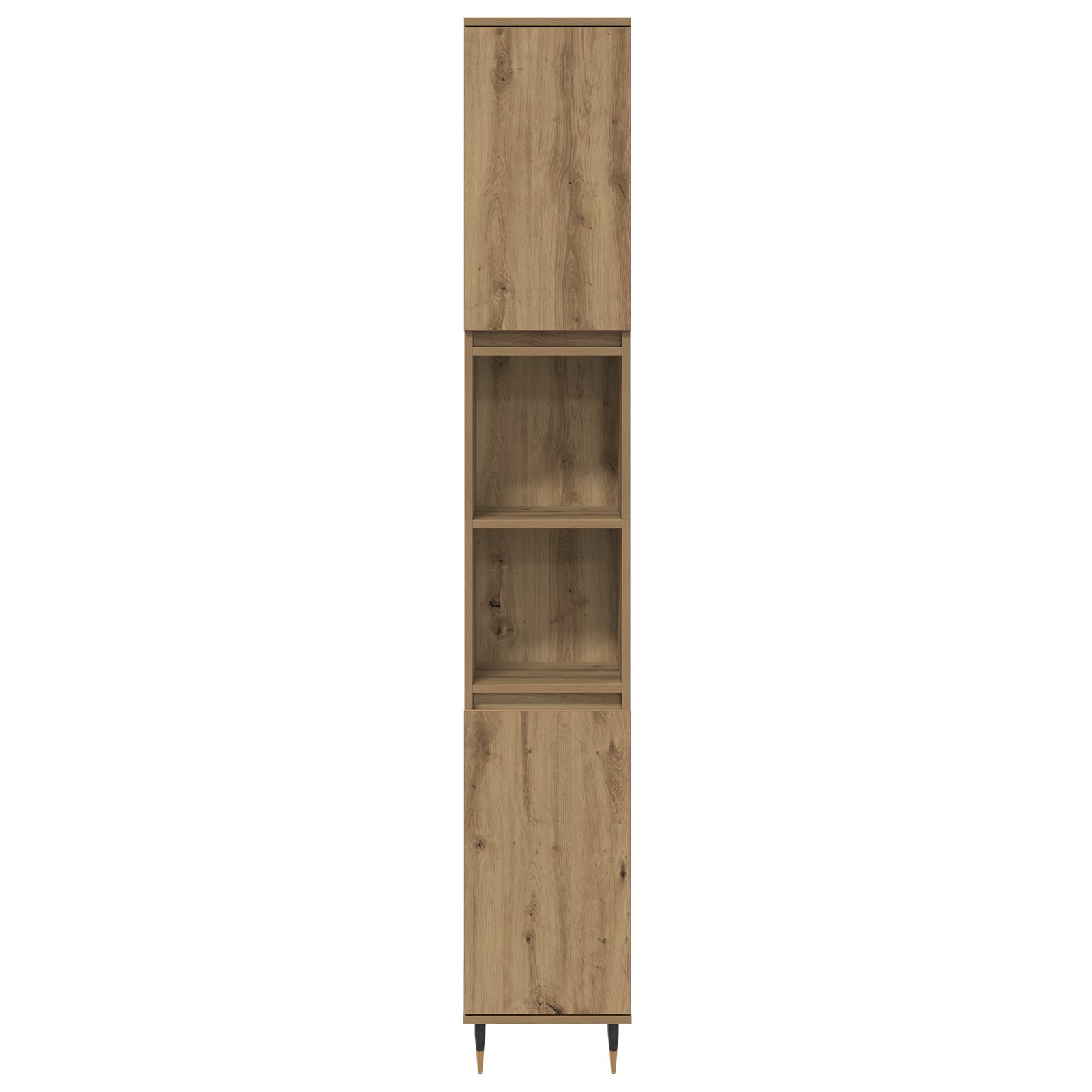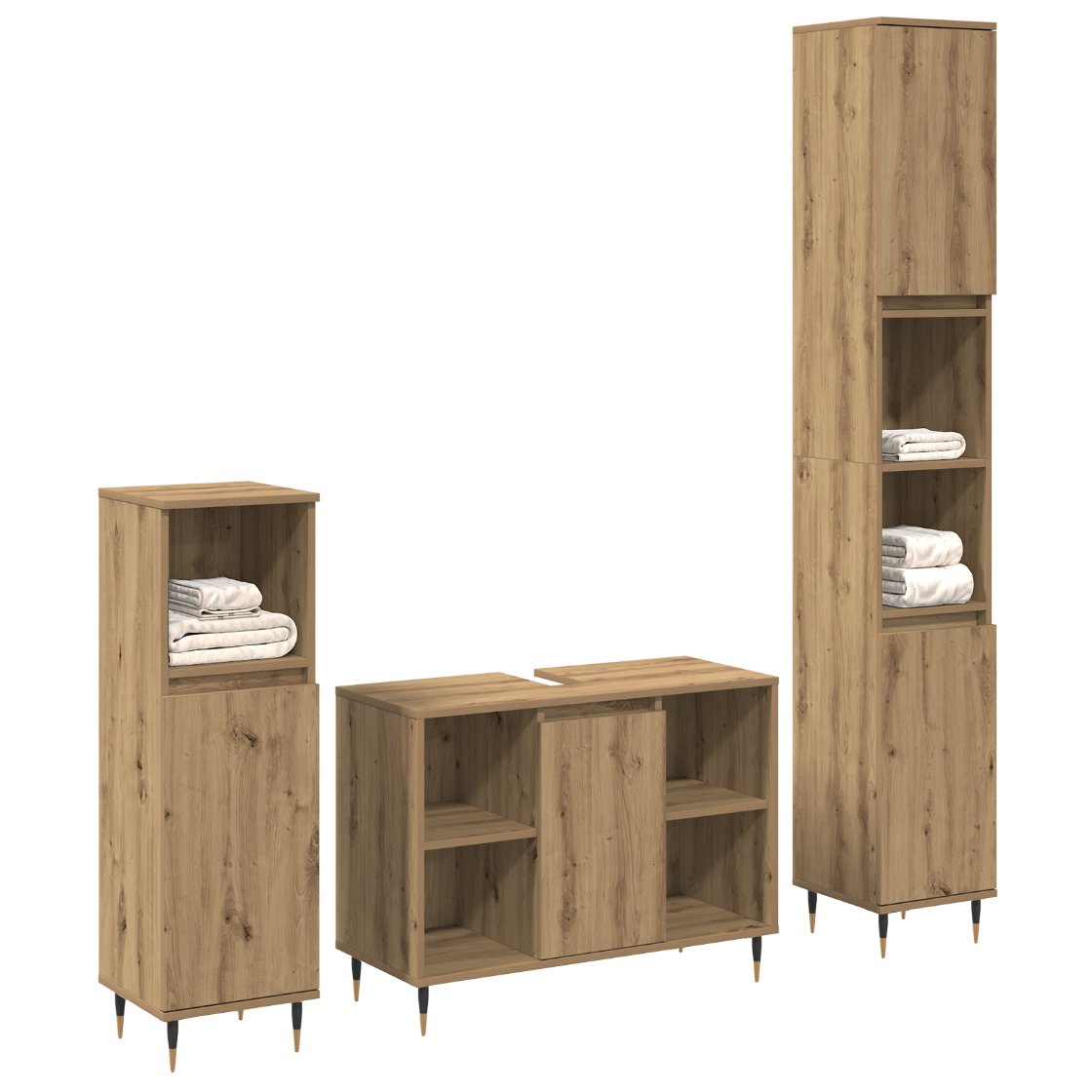 Dieses 3-teilige Badezimmermöbel Set vereint Funktionalität und modernen Stil. Das schöne Artisan Eichen-Finish bringt jedes Badezimmer zum Strahlen und bietet reichlich Platz für all deine wichtigen Dinge. Gestalte deinen Raum um: Der großzügige Stauraum lässt dich all deine Toilettenartikel und Handtücher verstauen, sodass dein Badezimmer ordentlich bleibt. Mit mehreren Regalen in drei praktischen Schränken hast du viele Möglichkeiten, um alles zu verstauen. Moderner Charme: Das Artisan Eichen-Finish bringt einen modernen Touch und wertet deine Badezimmerdeko auf. Jedes Stück hat glatte Oberflächen, die den Gesamtlook verbessern. Robust und zuverlässig: Hergestellt aus Eichenfurnier und MDF, ist dieses Set langlebig. Du kannst dir sicher sein, dass diese Schränke lange halten und eine stilvolle Kulisse bieten. Einfacher Zugang: Die Türen mit Standard-Scharnieren machen es super einfach, das zu erreichen, was du brauchst. Behalte alles ordentlich und genieße schnellen Zugriff. Schick und stilvoll: Jedes Stück hat schräg verlaufende Beine und matte schwarze Griffe, die einen modernen Touch verleihen und trotzdem stabil sind. Das gesamte Design ist ideal für alle, die eine praktische und schicke Stauraumlösung suchen.