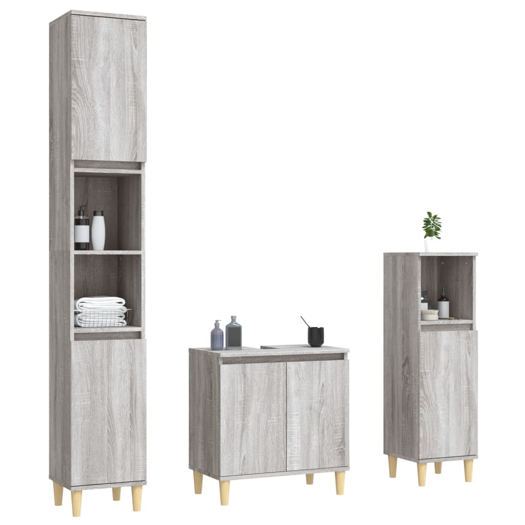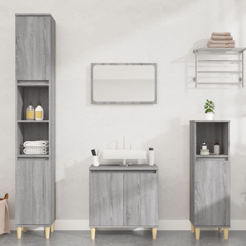 Dieses stilvolle Badmöbel-Set mit viel Stauraum ist eine ausgezeichnete Ergänzung für Ihr Badezimmer, denn es verleiht ihm ein aufgeräumtes und auffälliges Erscheinungsbild! Langlebiges Material: Holzwerkstoff ist ein Material von außergewöhnlicher Qualität mit glatter Oberfläche, das sich durch Festigkeit, Stabilität und Feuchtigkeitsbeständigkeit auszeichnet.Reichlich Stauraum: Diese Badezimmerschränke bieten reichlich Stauraum, um deine Badutensilien ordentlich aufzubewahren.Holzbeine: Die Beine aus massivem Eukalyptusholz verleihen den Badmöbeln eine natürliche und angenehme Optik und sorgen gleichzeitig für Stabilität.Einfache Reinigung: Das Badmöbel-Set lässt sich leicht mit einem feuchten Tuch reinigen.Stilvolles Design: Die klaren Linien und das schlanke Design fügen sich perfekt in dein Badezimmer ein. Achtung:Um ein Umkippen zu vermeiden, sollte dieses Produkt mit der mitgelieferten Wandhalterung gesichert werden. Gut zu wissen:Schrauben und Dübel sind für die Befestigung an der Wand nicht im Lieferumfang enthalten. Wir empfehlen, speziell für deine Wände geeignete Schrauben und Dübel zu finden und zu verwenden. Im Zweifelsfall wende dich an einen Fachmann. Bitte lese und befolge jeden Schritt der Anweisungen.