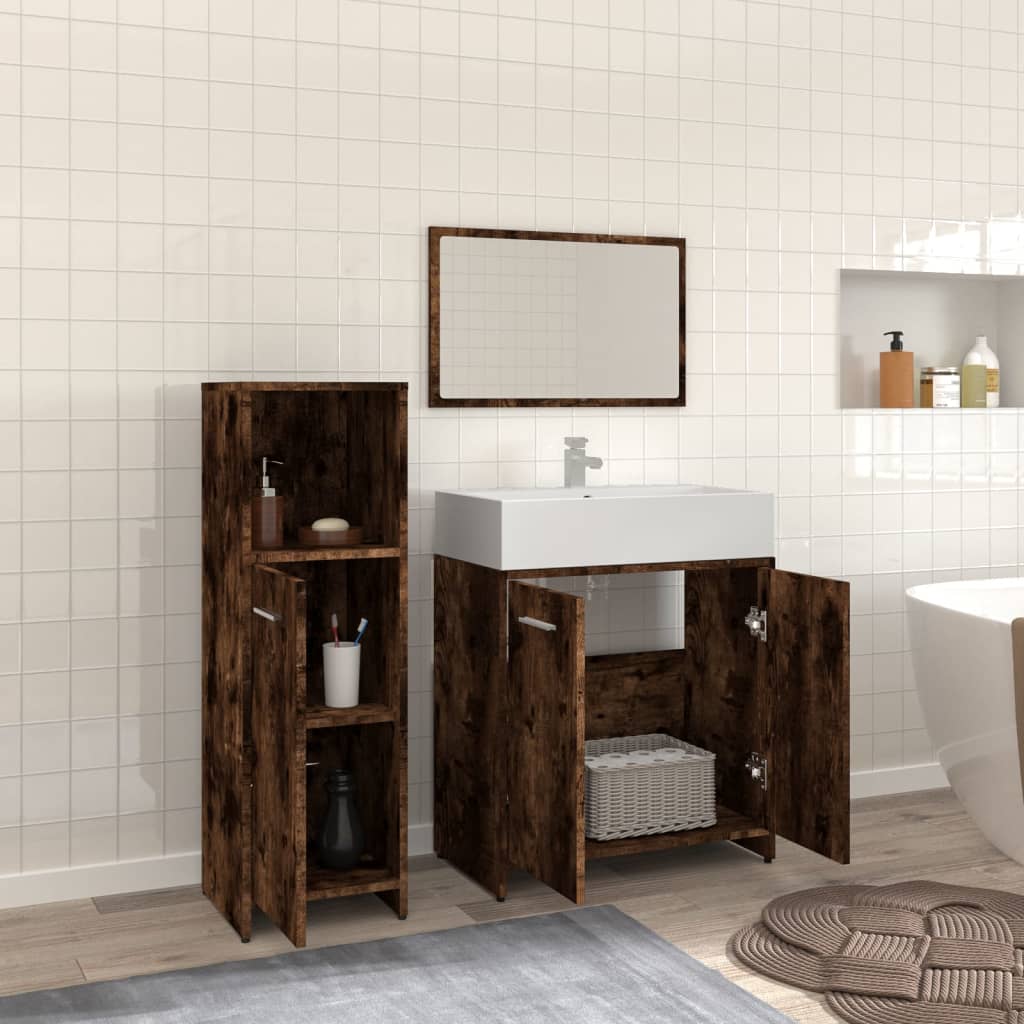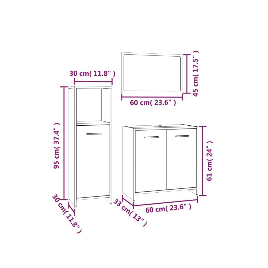 Dieses 3-teilige Badmöbel-Set stellt reichlich Stauraum zur Verfügung und ist eine schicke und zeitlose Ergänzung zu jedem Badezimmer oder Waschraum. Langlebiges Material: Holzwerkstoff ist ein Material von außergewöhnlicher Qualität mit glatter Oberfläche, das sich durch Festigkeit, Stabilität und Feuchtigkeitsbeständigkeit auszeichnet.Viel Stauraum: Der Badezimmerschrank bietet verschiedene Aufbewahrungsmöglichkeiten und zusätzlichen Platz, um verschiedene Sachen in deinem Badezimmer zu verstauen. Stilvolles Design: Durch seine klaren Linien und sein elegantes Design fügt sich das Badezimmer-Set perfekt in dein Badezimmer ein. Der Spiegel verleiht deiner Einrichtung einen hervorragenden Look. Praktische Griffe: Jede Tür ist mit einem Griff versehen, der das Öffnen und Schließen erleichtert. Einfache Reinigung: Der Waschbeckenschrank lässt sich leicht mit einem feuchten Tuch reinigen. Achtung:Um das Umkippen zu verhindern, muss dieses Produkt mit der mitgelieferten Wandhalterung gesichert werden. Hinweis:Jedes Produkt wird mit einer Montageanleitung in der Verpackung für einen einfachen Zusammenbau geliefert.