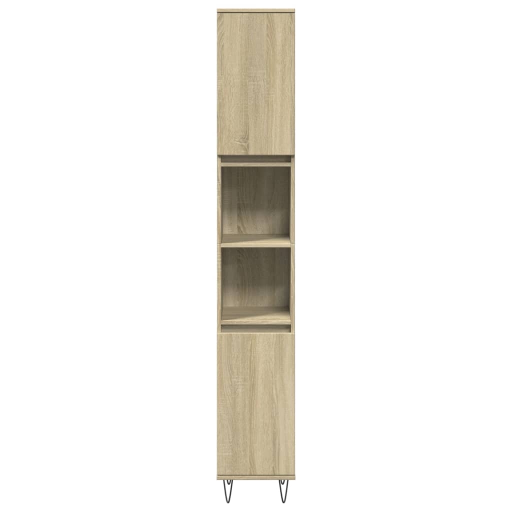 Dieses stilvolle Badmöbel-Set ist eine hervorragende Ergänzung zu deinem Badezimmer und verleiht ihm ein aufgeräumtes und eindrucksvolles Aussehen! Langlebiges Material: Holzwerkstoff ist ein Material von außergewöhnlicher Qualität mit glatter Oberfläche, das sich durch Festigkeit, Stabilität und Feuchtigkeitsbeständigkeit auszeichnet.Reichlich Stauraum: Dieses Badmöbel-Set bietet reichlich Stauraum, um wichtigste Toilettenartikel und Badutensilien wie Seife, Shampoo, Zahnpasta usw. aufzubewahren.Füße aus Eisen: Die Eisenfüße verleihen deiner Einrichtung einen industriellen Stil und sorgen gleichzeitig für die Stabilität des Badschranks.Praktische Tür: Sorge für Ordnung in deinem Bad, indem du wichtige Kleinigkeiten in diesem Badezimmerschrank hinter der Tür verstaust. Die Schranktür kann je nach Belieben links oder rechts öffnend montiert werden. Gut zu wissen:Schrauben und Dübel sind für die Befestigung an der Wand nicht im Lieferumfang enthalten. Wir empfehlen dir, speziell für deine Wände geeignete Schrauben und Dübel zu finden und zu verwenden. Im Zweifelsfall wende dich an einen Fachmann. Bitte lese und befolge jeden Schritt der Anweisungen. Achtung:Um ein Umkippen zu vermeiden, sollte dieses Produkt mit der mitgelieferten Wandhalterung gesichert werden.