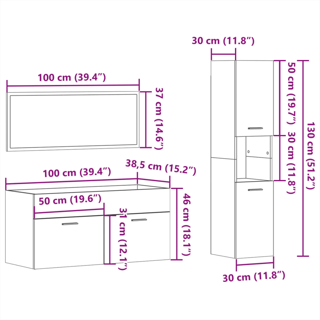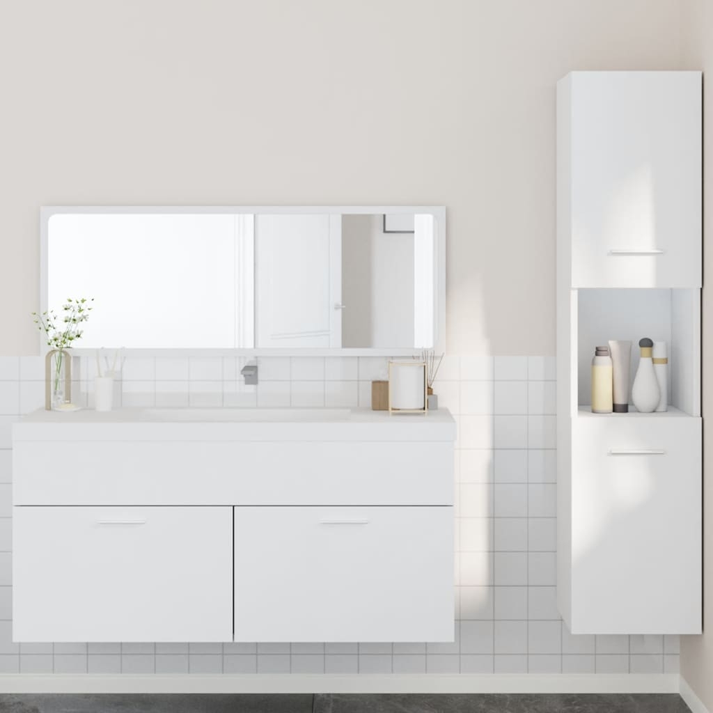 Dieses stilvolle Badmöbel-Set ist eine hervorragende Ergänzung zu deinem Badezimmer und verleiht ihm ein aufgeräumtes und eindrucksvolles Aussehen! Langlebiges Material: Holzwerkstoff ist ein Material von außergewöhnlicher Qualität mit glatter Oberfläche, das sich durch Festigkeit, Stabilität und Feuchtigkeitsbeständigkeit auszeichnet. Aus Holzwerkstoff gefertigt, ist dieser Badschrank robust und langlebig. Reichlich Stauraum: Das Badmöbel bietet reichlich Stauraum, um deine Badutensilien ordentlich aufzubewahren. Wandmontage: Der Badezimmerschrank und der Spiegel lassen sich platzsparend an der Wand befestigen. Auf diese Weise maximierst du deine Bodenfläche und sorgst für mehr Ordnung in deinem Bad.Minimalistischer Spiegel: Der minimalistische Spiegel bietet eine klare Sicht beim Auftragen von Make-up und verleiht dem Badezimmerunterschrank eine stilvolle Note.Praktisches Design: Die Oberplatte des Badschrank bietet den idealen Platz für das Waschbecken. Gut zu wissen:Schrauben und Dübel für die Montage an der Wand sind nicht enthalten. Passendes Montagezubehör muss separat gekauft werden. Wenn du dir bezüglich der Montage nicht sicher bist, wende dich bitte an einen Fachmann. Bitte lies und befolge jeden Schritt in der Anleitung.