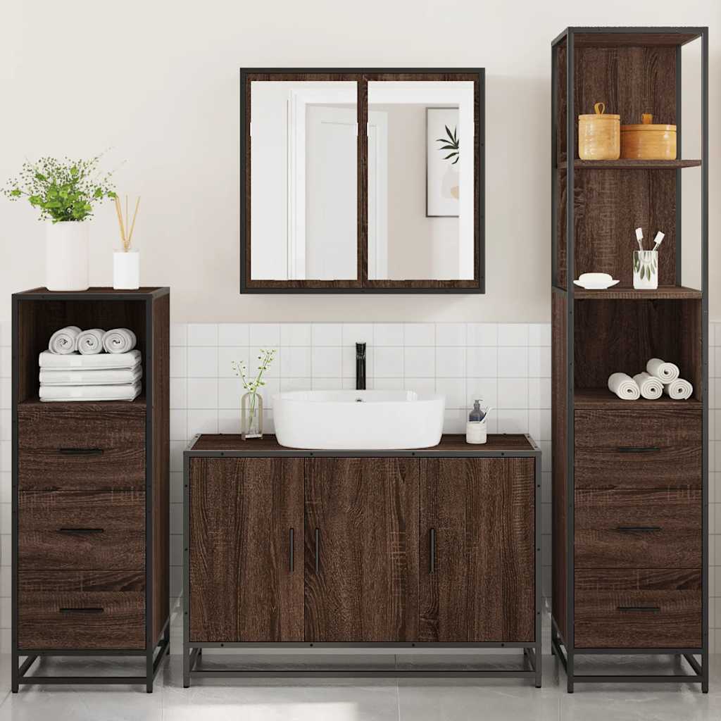 Dieses stilvolle Badmöbel-Set ist eine hervorragende Ergänzung zu deinem Badezimmer und verleiht ihm ein aufgeräumtes und eindrucksvolles Aussehen! Starkes und langlebiges Material: Holzwerkstoff ist ein langlebiges und robustes Material mit einer glatten Oberfläche, das gegen Feuchtigkeit, Verformung und Rissbildung beständig ist, wodurch es eine zuverlässigen Wahl für die Herstellung von Möbeln ist.Stabil und haltbar: Mit einem Metallgestell versehen, verleiht das Lowboard deinem Interieur eine industrielle Note und bietet außergewöhnliche Haltbarkeit, Stabilität und Korrosionsbeständigkeit.Reichlich Stauraum: Der Waschbeckenunterschrank bietet reichlich Stauraum, um wichtige Sachen ordentlich und griffbereit aufzubewahren.Praktische Oberplatte: Der Bad-Unterschrank ist oben mit einer Öffnung versehen, wodurch er sich ideal zum Aufnehmen des Waschbeckens eignet.Wandmontage: Der Badezimmer-Spiegelschrank lässt sich platzsparend an der Wand montieren und eignet sich daher perfekte für kleinere Räume. Achtung:Um ein Umkippen zu vermeiden, sollte dieses Produkt mit der mitgelieferten Wandhalterung gesichert werden. Gut zu wissen:Schrauben und Dübel für die Montage an der Wand sind nicht enthalten. Passendes Montagezubehör muss separat gekauft werden. Wenn du dir bezüglich der Montage nicht sicher bist, wende dich bitte an einen Fachmann. Bitte lies und befolge jeden Schritt in der Anleitung.