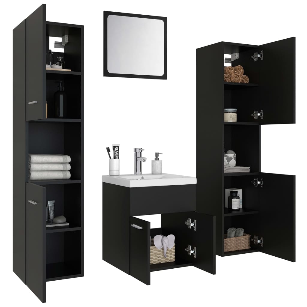 Mit diesem stilvollen Badmöbel-Set schaffen Sie zusätzlichen Stauraum in Ihrem Badezimmer. Die klaren Linien und das schlichte Design fügen sich perfekt in Ihr Bad ein. Das Möbelset besteht aus einem Waschbeckenunterschrank, 2 Hochschränken und einem Spiegel. Der schicke Waschbeckenunterschrank verfügt über 1 Fach und bietet den idealen Platz für Ihr Waschbecken, während die Hochschränke mit je 5 Fächern und je 2 Türen versehen sind und dadurch reichlich Platz zum Verstauen verschiedener Sachen im Badezimmer zur Verfügung stellen. Der Spiegel macht auch eine gute Figur in Ihrer Inneneinrichtung. Darüber hinaus lässt sich dieses Badmöbel-Set mit einem feuchten Tuch einfach reinigen. Bitte beachten Sie: Das Waschbecken, der Wasserhahn und die Ablaufgarnitur sind nicht im Lieferumfang enthalten.