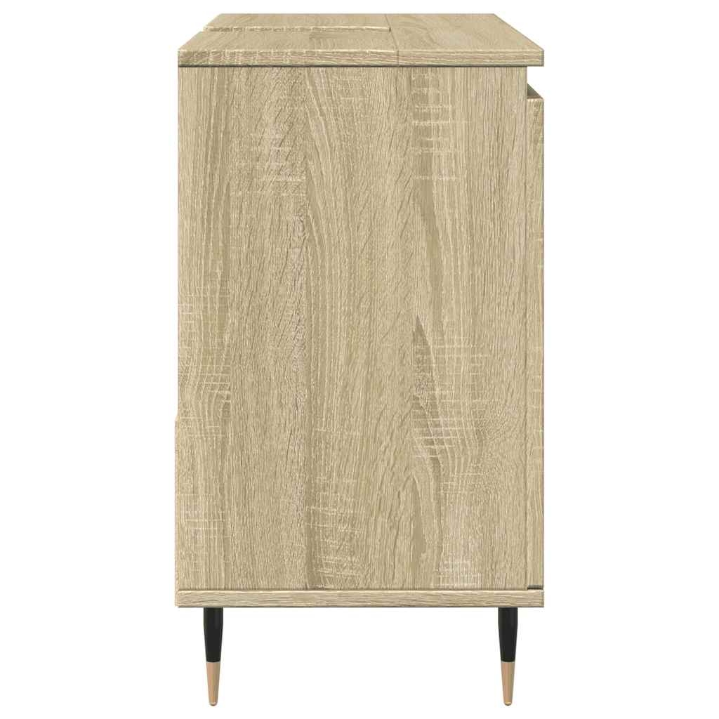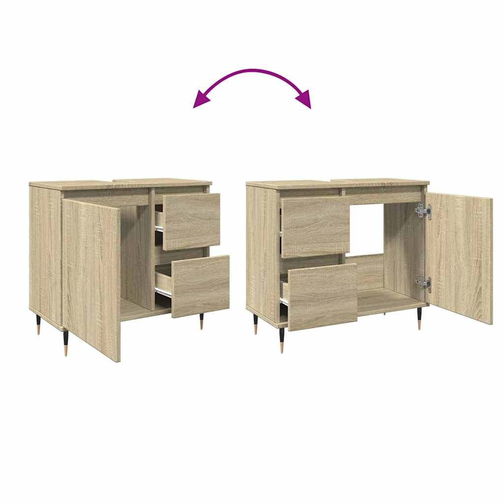 Dieser Waschbeckenunterschrank ist eine großartige Bereicherung für dein Badezimmer und verleiht ihm ein ordentliches und auffälliges Aussehen! Langlebiges Material: Holzwerkstoff ist ein Material von außergewöhnlicher Qualität mit glatter Oberfläche, das sich durch Festigkeit, Stabilität und Feuchtigkeitsbeständigkeit auszeichnet.Reichlich Stauraum: Der Badschrank mit 1 großen Fach und 2 Schubladen bietet reichlich Platz, um wichtigste Sachen im Badezimmer zu verstauen.Praktische Tür: Sorge für Ordnung in deinem Bad, indem du wichtige Kleinigkeiten in diesem Badezimmerschrank hinter der Tür verstaust. Die Schranktür kann je nach Belieben links oder rechts öffnend montiert werden.Füße aus Eisen: Die Eisenfüße verleihen deiner Einrichtung einen industriellen Stil und sorgen gleichzeitig für die Stabilität des Badschranks. Achtung:Um ein Umkippen zu vermeiden, sollte dieses Produkt mit der mitgelieferten Wandhalterung gesichert werden.