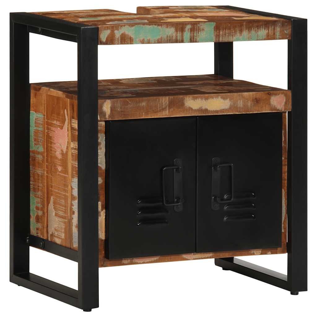 Dieser Waschbeckenunterschrank ist eine großartige Bereicherung für dein Badezimmer und verleiht ihm eine elegante Optik im Retro-Stil! Robust und stabil: Massives Altholz besteht aus wiederverwendeten Holzarten wie Teakholz, Mangoholz, Kiefernholz und Buche. Diese Materialien werden aus alten Gebäuden wie Fabriken, Schuppen und Booten recycelt. Gebrauchsspuren und die sichtbare Maserung erzählen die Geschichte jedes einzelnen Stücks und verleihen jedem Möbelstück einen einzigartigen Look.Stabil und haltbar: Mit einem Eisengestell versehen, verleiht der Schrank deinem Interieur eine industrielle Note und bietet auch außergewöhnliche Haltbarkeit und Stabilität.Praktische Tür: Dank der Tür lassen sich deine Sachen ordentlich, geschützt und außer Sicht aufbewahren.Praktische Oberplatte: Der Bad-Unterschrank ist oben mit einer Öffnung versehen, wodurch er sich ideal zum Aufnehmen des Waschbeckens eignet.Reichlich Stauraum: Der Waschbeckenschrank bietet reichlich Platz, um wichtigste Toilettenartikel und Badutensilien wie Seife, Shampoo, Zahnpasta usw. zu verstauen. Gut zu wissen:Jedes Stück ist ein Unikat, das in Farbe und Maserung variiert. Die Lieferung erfolgt in zufälliger Reihenfolge, wodurch die Exklusivität und Individualität deines Produkts gewährleistet wird.