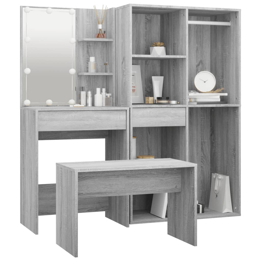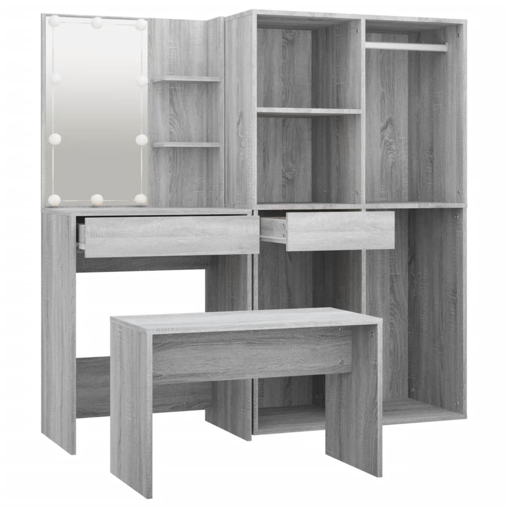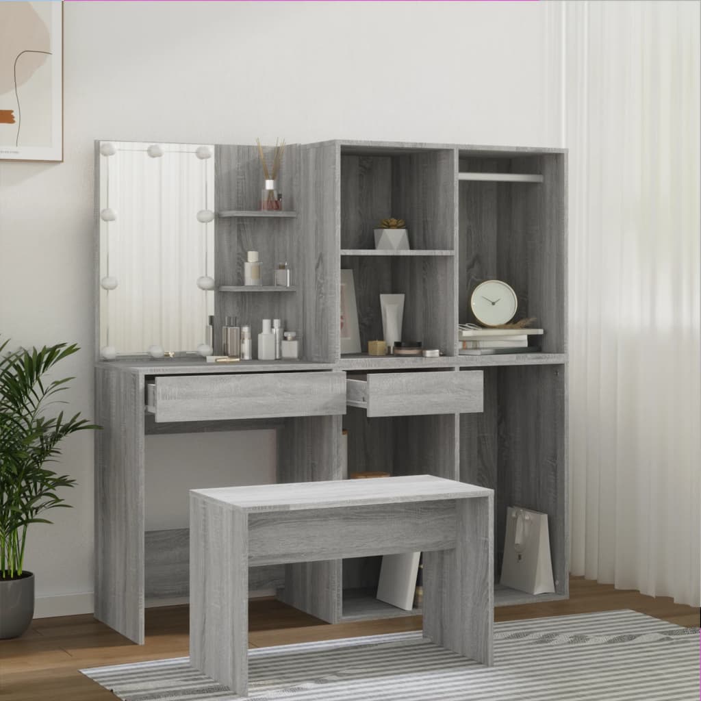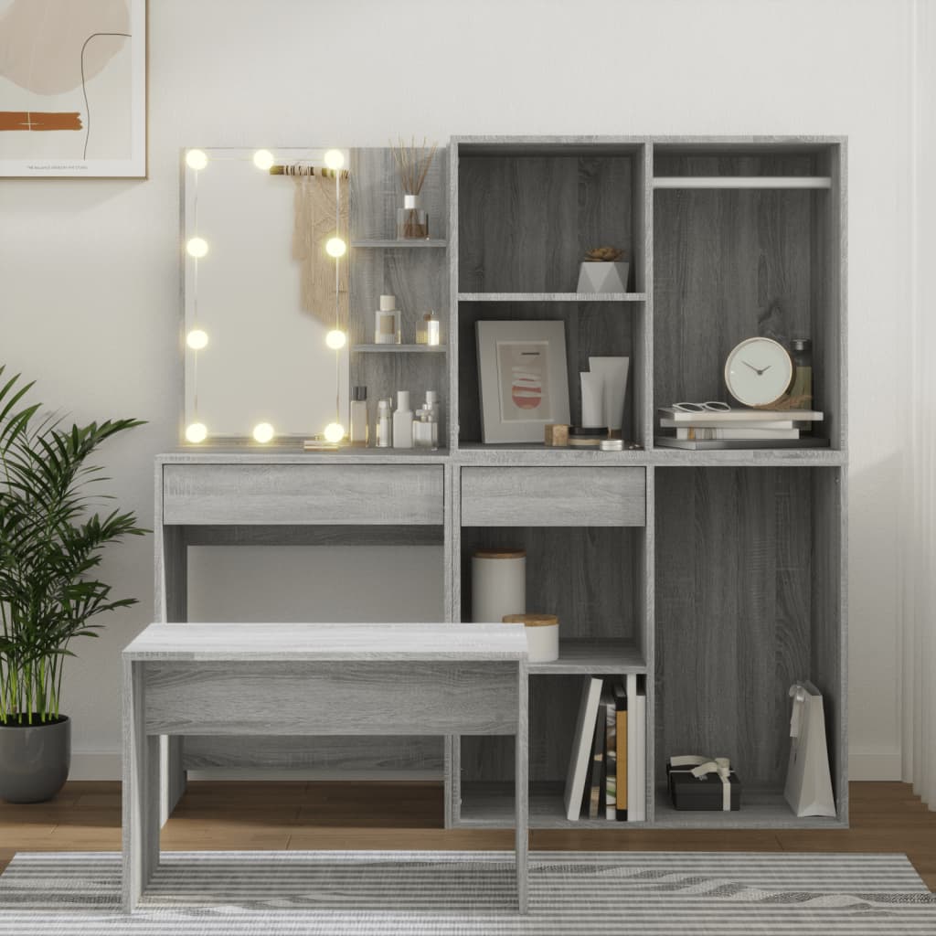 Das trendige Schminktisch-Set verleiht deinem Schlafzimmer einen zeitlosen, raffinierten Look. Das Schminktisch-Set mit LED-Beleuchtung ist eine perfekte Ergänzung für deine Schlafzimmereinrichtung und hält auch deine Kosmetika immer griffbereit! Stabiles Material: Holzwerkstoff ist ein Material hoher Qualität mit glatter Oberfläche, das sich durch Festigkeit, Stabilität und Feuchtigkeitsbeständigkeit auszeichnet.Allzweckspiegel: Der Schminktisch mit Spiegel ist perfekt für deine tägliche Schönheitsroutine. Mit dem Spiegel kannst du dein Gesicht pflegen und auch dein Make-up auftragen!Viel Stauraum: Der Schminktisch mit Hocker bietet viel Platz für einfachen Zugriff auf Make-up, Schmuck und anderen Accessoires.LED-Beleuchtung: Der Schminktisch verfügt auch über LED-Lampen mit USB, die einfach von Warmweiß auf Kaltweiß umgeschaltet werden können. Dabei beleuchten die LED-Lampen rund um den Spiegel dein Gesicht optimal.Vielseitig einsetzbar: Dieses Schminktisch-Set eignet sich für verschiedene Bereiche, sei es Schlafzimmer, Ankleide oder jeden anderen Raum, in dem du es aufstellen möchtest. Warnung:Um das Umkippen zu verhindern, muss dieses Produkt mit der mitgelieferten Wandhalterung gesichert werden. Hinweis:Jedes Produkt wird mit einer Montageanleitung in der Verpackung für eine einfache Montage geliefert.
