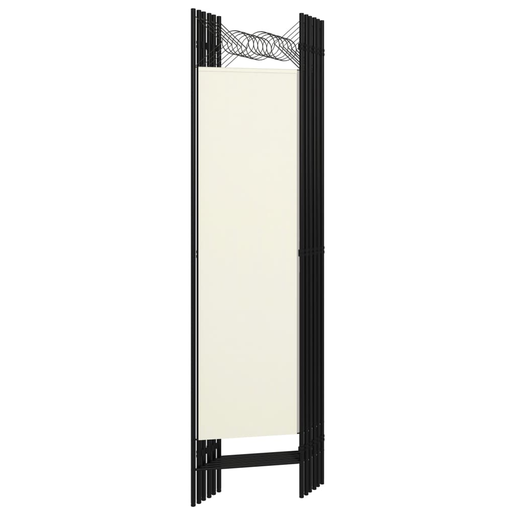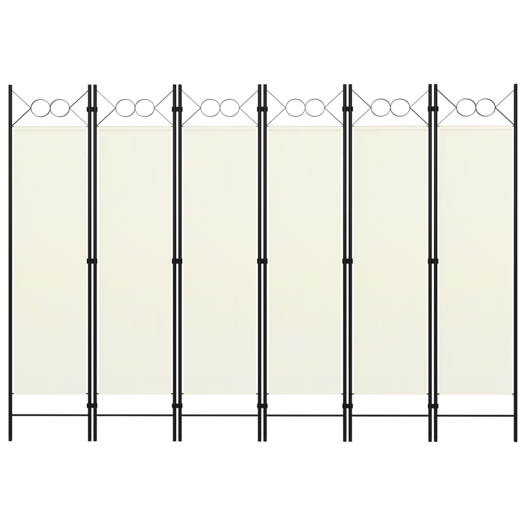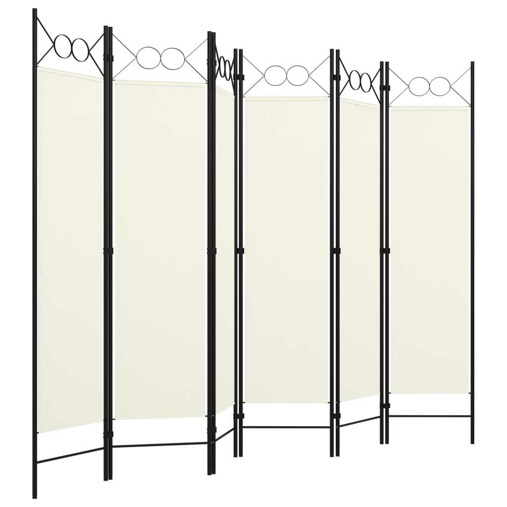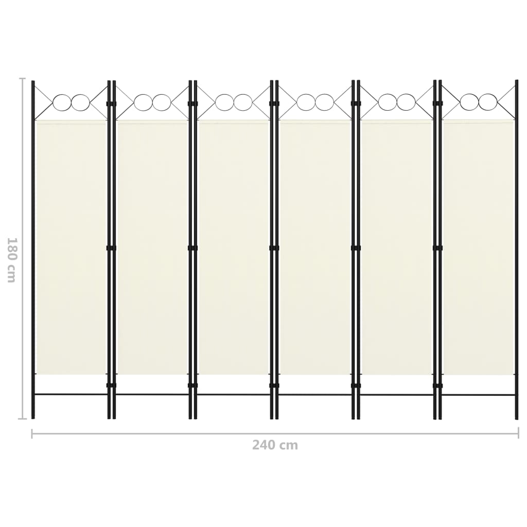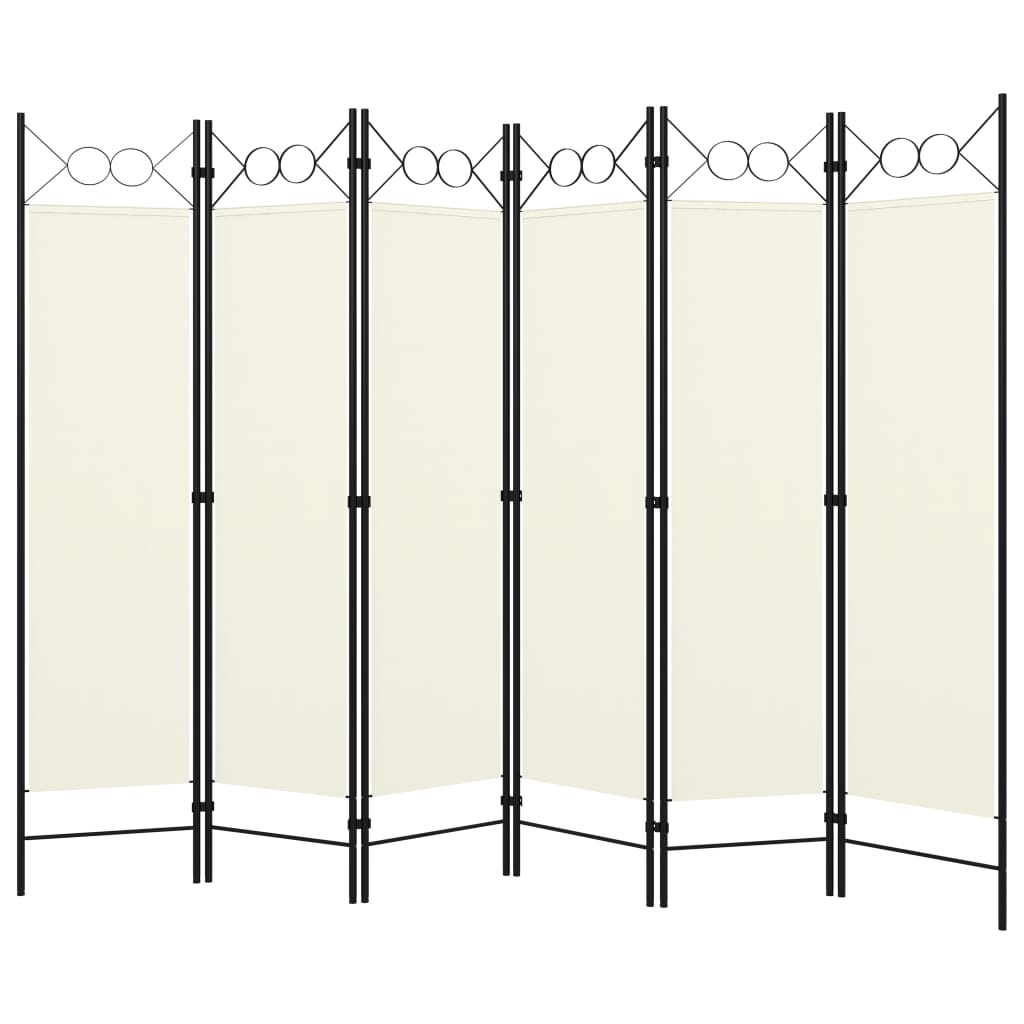 Der freistehende 6-teilige Raumteiler kann als Trennwand, Sichtschutz oder zur Dekoration verwendet werden. Er bietet ideale Privatsphäre im Schlafzimmer oder in einem anderen Raum deiner Wohnung. Die obere Verzierung mit kreisförmigem Muster verleiht zusätzliche Eleganz. Dieser Raumteiler besteht aus einem pulverbeschichteten Eisenrahmen und Stoffschirmen und kann bei Nichtgebrauch leicht zusammengeklappt werden. Hinweis: Der Stoff schirmt das Sonnenlicht nicht vollständig ab.