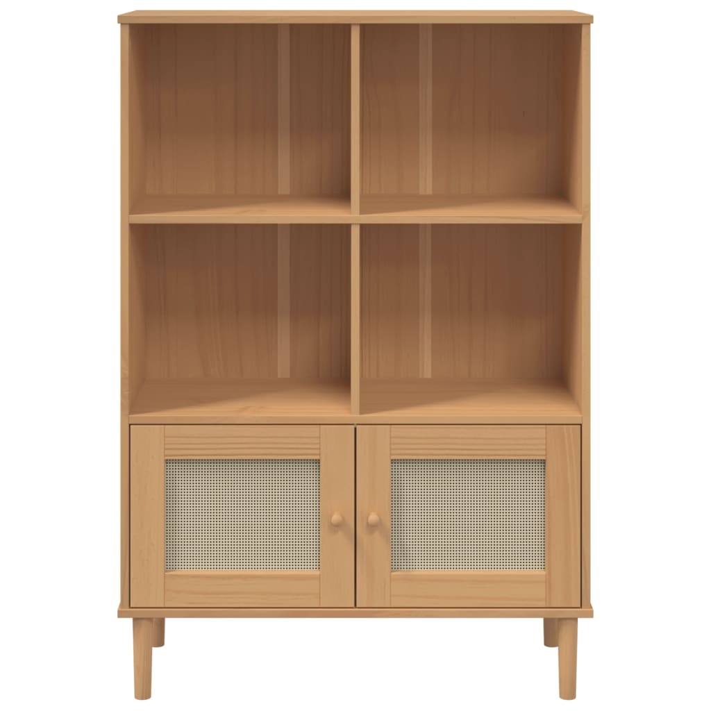 Dieses Bücherregal aus Holz bietet eine ideale Lösung für die ordentliche Aufbewahrung deiner Bücher und ist eine dekorative und zugleich praktische Ergänzung zu deinem Zuhause. Massives Kiefernholz: Massives Kiefernholz ist ein wunderschönes Naturmaterial. Kiefernholz weist eine gerade Maserung auf und die Aststellen verleihen dem Material seine charakteristische, rustikale Optik.UV-Lackierung: UV-Lackierung ist eine spezielle Art von Lackierung, die mittels einer UV-Trocknungsanlage aufgetragen wird. Im Vergleich zu anderen Lackierungen sorgt sie für eine lebendigere, luxuriösere und taktilere Oberflächenbearbeitung.Reichlich Stauraum: Das Bücherregal mit Türen bietet viel Stauraum, um deine Zeitschriften, Bücher, Dekoartikel und andere Alltagssachen ordentlich und griffbereit aufzubewahren.Rattan-Optik: Die Türfront ist aus Poly Rattan handgefertigt, wodurch Mid-Century Modernismus mit Boho-Stil kombiniert werden, um deinem Interieur eine einladende und dennoch stilvolle Note zu verleihen. Achtung:Um ein Umkippen zu vermeiden, sollte dieses Produkt mit der mitgelieferten Wandhalterung gesichert werden.