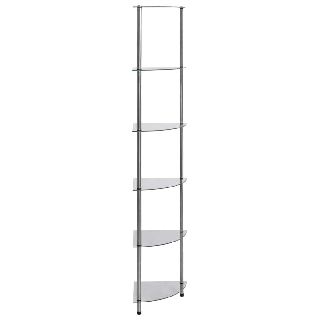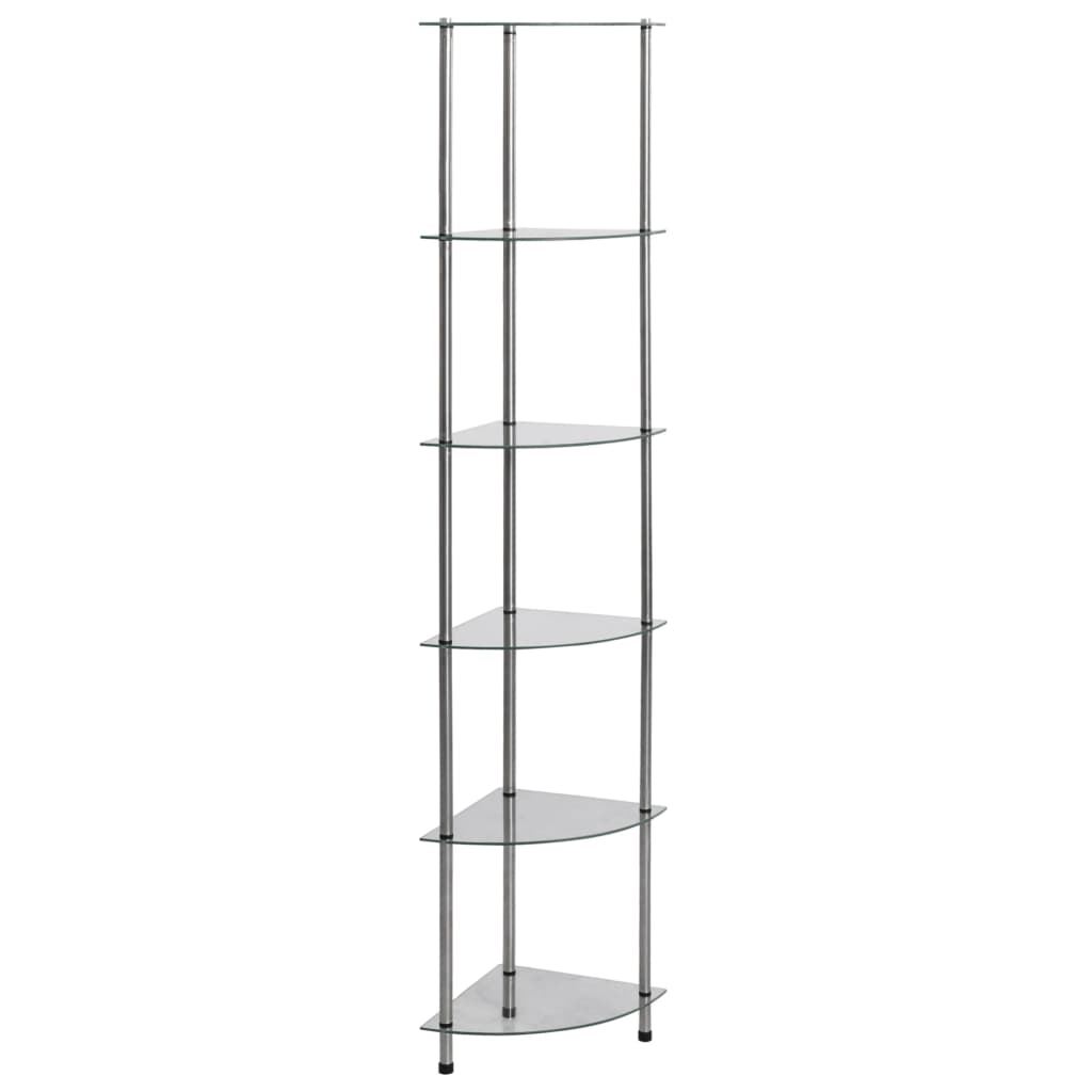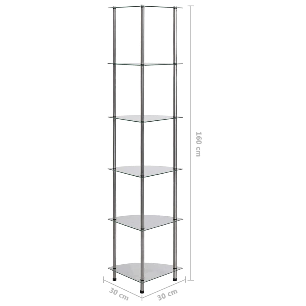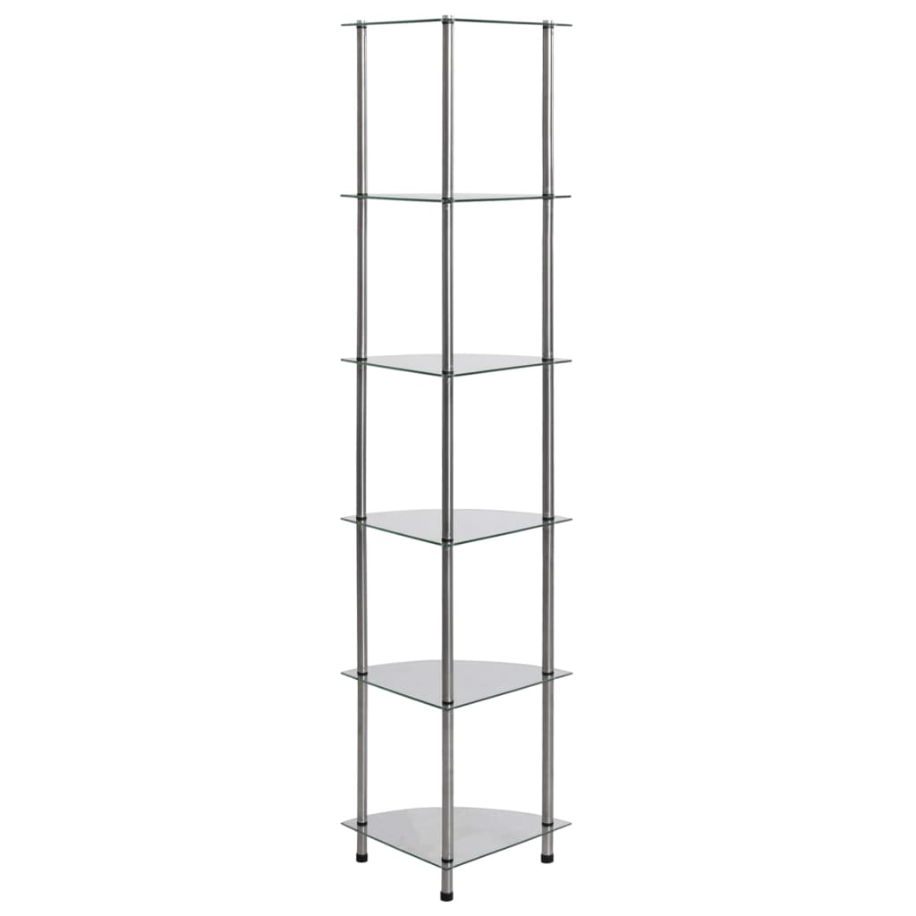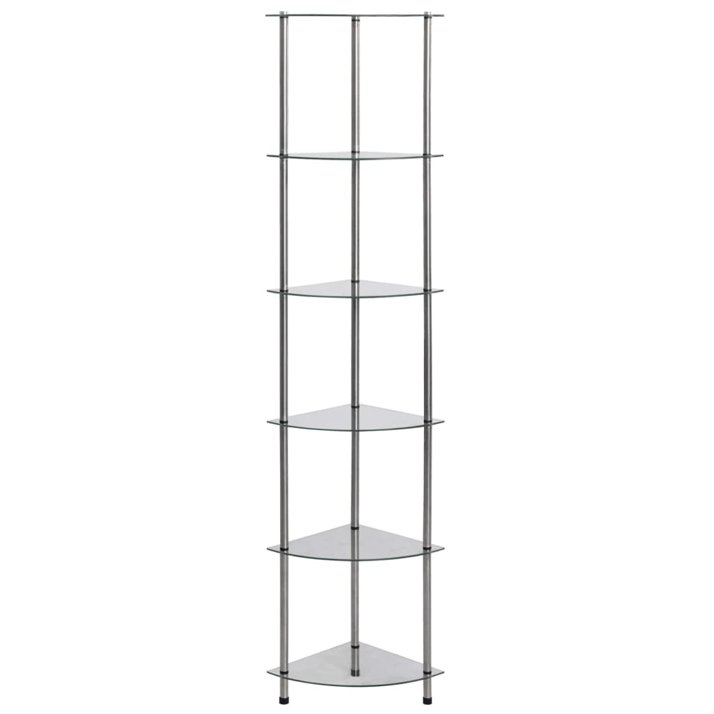 Verleihen Sie Ihrem Wohnraum mit diesem modernen und praktischen Glasregal einen Hauch von Stil! Die Vitrine bietet mit ihren sechs Ablagen reichlich Platz. Sie können dieses Mehrzweckregal im Wohnzimmer oder Büro aufstellen, um Ihre Sammlerstücke, Fotorahmen oder Topfpflanzen zur Schau zu stellen, aber auch im Bad, um Ihre wichtigsten Sachen organisiert zu halten. Aus starkem Hartglas und strapazierfähigem Edelstahl gefertigt, ist dieses Regal äußerst robust und sicher. Des Weiteren lässt sich die glatte Oberfläche mit einem feuchten Tuch ganz einfach reinigen. Die Vitrine ist einfach zu montieren.