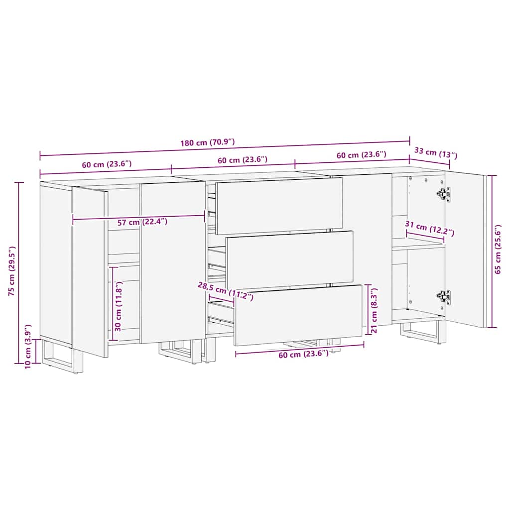 Diese Sideboards bieten sowohl dekorativen Reiz als auch praktischen Stauraum und sind damit eine perfekte Ergänzung zu deinem Zuhause. Robustes und stabiles Material: Massives Mangoholz ist ein robustes, tropisches Hartholz, das wegen seiner außergewöhnlichen Haltbarkeit und Festigkeit für den Möbelbau sehr bevorzugt wird. Die optisch ansprechende Holzmaserung macht jedes Möbelstück zu einem Unikat.Beine aus Metall: Dieser Schrank wird von stabilen Metallfüßen getragen, um Stabilität, Sicherheit und Festigkeit zu gewährleisten.Viel Stauraum: Der Schrank bietet reichlich Stauraum, um verschiedene Alltagssachen ordentlich und griffbereit aufzubewahren.Praktische Tür: Dank der Tür lassen sich deine Sachen ordentlich, geschützt und außer Sicht aufbewahren. Achtung:Um ein Umkippen zu vermeiden, sollte dieses Produkt mit der mitgelieferten Wandhalterung gesichert werden. Gut zu wissen:Jedes Stück ist ein Unikat, das in Farbe und Maserung variiert. Die Lieferung erfolgt in zufälliger Reihenfolge, wodurch die Exklusivität und Individualität deines Produkts gewährleistet wird.