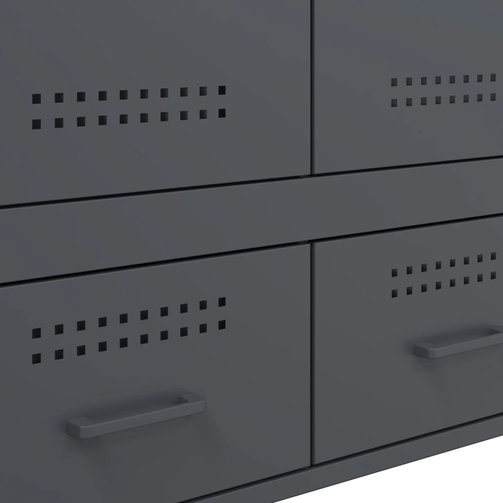 Dieses robuste Highboard im Industrie-Stil ist eine zeitlose und moderne Ergänzung zu deinem Schlafzimmer oder Wohnzimmer. Stabiles Material: Der Rahmen des Sideboards besteht aus kaltgewalztem Stahl. Kaltgewalzter Stahl ist eine Art kohlenstoffarmer Stahl, der im „Kaltwalzverfahren“ hergestellt und bei nahezu normalen Raumtemperaturen verarbeitet wird. Kaltgewalzter Stahl besitzt eine glattere Oberfläche, eine höhere Festigkeit und lässt sich präziser verarbeiten.Reichlich Stauraum: Dieser Schrank bietet reichlich Platz, um deine Zeitschriften, Bücher, DVDs, Dekoartikel und andere kleine Gegenstände gut organisiert und in Reichweite aufzubewahren.Verstellbare Schraubfüße: Dieser Beistellschrank ist mit vier Stellfüßen ausgestattet, um Bodenunebenheiten auszugleichen und Stabilität und Gleichgewicht zu gewährleisten.Praktische Tür: Hinter den Türen kannst du kleinere Gegenstände verstauen, und so einen sauberen und aufgeräumten Raum genießen.Einfache Reinigung: Der Schrank aus Metall ist mit einem feuchten Tuch leicht zu reinigen und erfordert wenig Pflege. Achtung:Um ein Umkippen zu vermeiden, sollte dieses Produkt mit der mitgelieferten Wandhalterung gesichert werden.