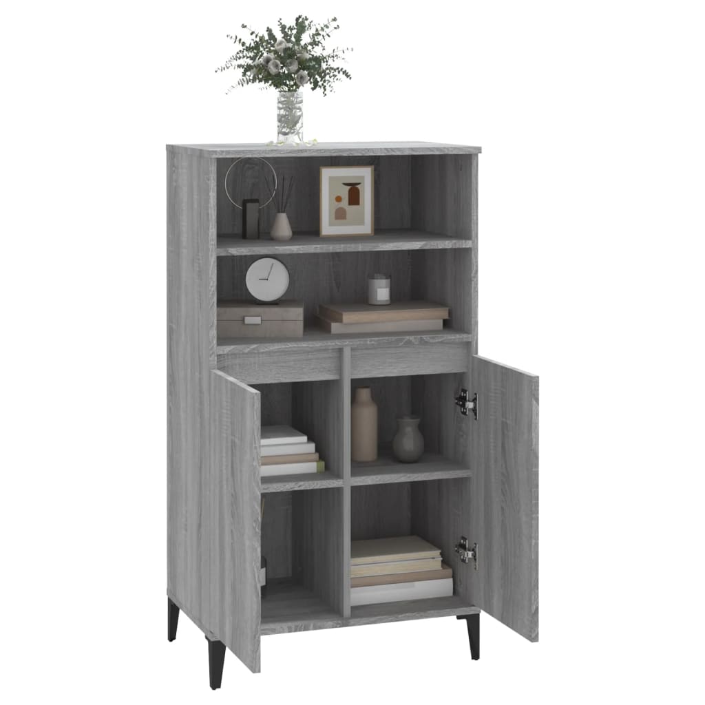 Dieses klassische Highboard soll eine dekorative und praktische Ergänzung für dein Zuhause sein. Langlebiges Material: Dieses Highboard ist aus Holzwerkstoff gefertigt. Holzwerkstoff ist ein Material von außergewöhnlicher Qualität mit glatter Oberfläche, das sich durch Festigkeit, Stabilität und Feuchtigkeitsbeständigkeit auszeichnet.Stabile Metallfüße: Die Metallfüße verleihen dem Beistellschrank eine industrielle und angenehme Note und sorgen gleichzeitig für Stabilität.Viel Stauraum: Das Sideboard verfügt über 2 offene Ablagen und 4 Fächer und bietet dadurch reichlich Stauraum, um verschiedene Alltagssachen gut organisiert und griffbereit aufzubewahren.Praktisches Design: Dieser Lagerschrank verfügt über Türen, die deine Sachen vor Staub und Schmutz schützen.Stabile Oberplatte: Du kannst auch deine Lieblingsfotos, Dekoartikel oder Topfpflanzen auf dieses Sideboard stellen, um deinen Wohnraum zu bereichern. Achtung:Um das Umkippen zu verhindern, muss dieses Produkt mit der mitgelieferten Wandhalterung gesichert werden. Hinweis:Jedes Produkt wird mit einer Montageanleitung in der Verpackung für eine einfache Montage geliefert.