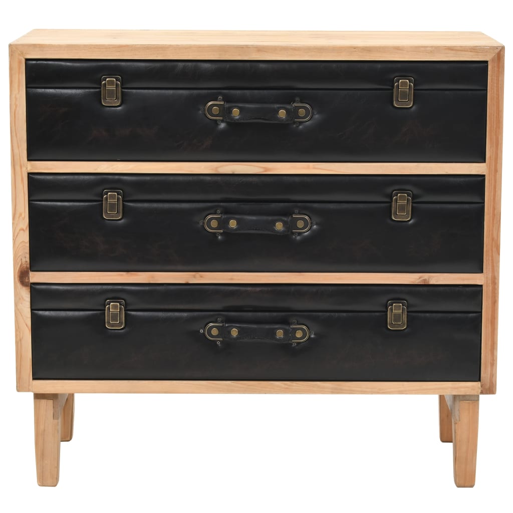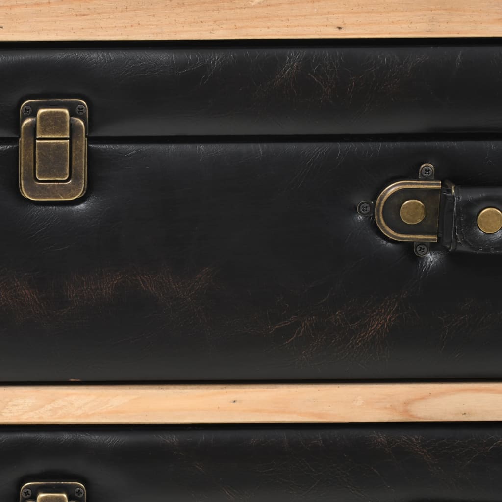 Dieser Schubladenschrank aus Holz im Retro-Stil mit Schubladenfronten im Koffer-Design ist eine dekorative Ergänzung für das Schlafzimmer oder Wohnzimmer. Dieses äußerst stabile und langlebige Wohnzimmermöbel wurde aus massivem Tannenholz gefertigt. Die robuste Oberplatte bietet den idealen Platz für Bilderrahmen, Vasen, Obstkörbe oder andere dekorative Gegenstände. Die Schubladen bietet ausreichend Stauraum, um verschiedene Gegenstände ordentlich aufzubewahren. Die einzigartig gestalteten Fronten der Schubladen unterstreichen den Vintage-Stil der Kommode. Die Montage ist kinderleicht.