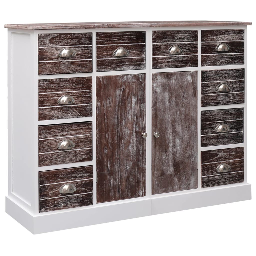 Mit seinem stilvollen Look wird dieses Sideboard aus Holz das ideale Aufbewahrungsmöbel in deinem Zuhause! Diese Anrichte besteht aus hochwertigem Paulownia- und Pappelholz und robuster MDF-Platte; dadurch ist sie äußerst robust und langlebig. Die Kommode mit 10 Schubladen und 2 Schrankfächern bietet ausreichend Stauraum für verschiedene Gegenstände wie Schlüssel, Notizblöcke, Bücher, Zeitschriften, Akten, Sammlerstücke und andere wichtige Dinge. Darüber hinaus eignet sich die große Tischplatte ideal zum Abstellen von verschiedenen Dingen oder zum Präsentieren von Dekoartikeln. Die Anrichte kann als separat zwei kleinere Schränke oder zusammengestellt als eine große Kommode verwendet werden. Das Sideboard ist einfach zu montieren. Im Lieferumfang sind 2 einzelne Sideboards (als ein Set) enthalten.