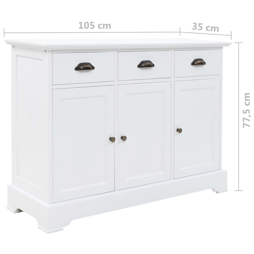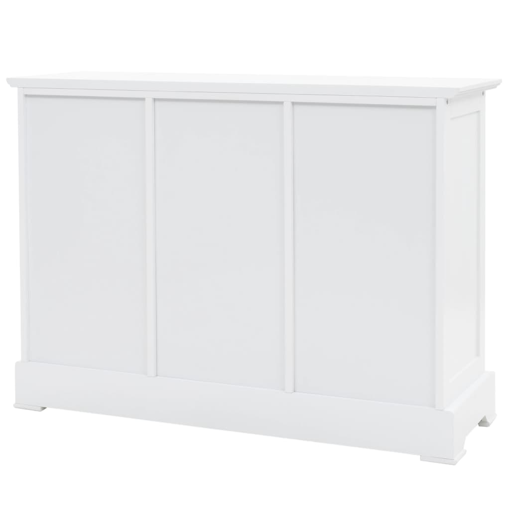 Mit seinem schicken Design in Weiß ist diese Kommode eine perfekte Ergänzung für dein Wohnzimmer oder jedes andere Zimmer in deinem Zuhause. Sie kann auch als Highboard, Flurschrank oder gar Fernsehschrank verwendet werden. Die Kommode ist aus MDF gefertigt und mit Metallgriffen an den Schubladen und Türen versehen. Ausgestattet mit 3 Schubladen und 3 großen Schrankfächern bietet die Anrichte ausreichend Stauraum für Geschirr, Bücher und Zeitschriften, Elektronikgeräte und andere Gegenstände. Die Oberplatte eignet sich ideal, um Dekoartikel, Fotorahmen und Topfpflanzen zur Schau zu stellen. Der Zusammenbau ist kinderleicht.