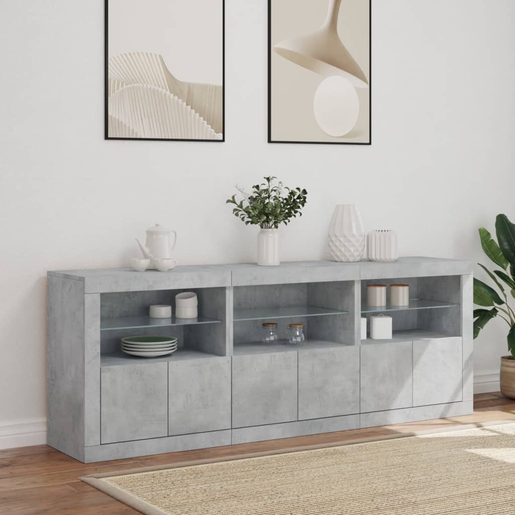 Dekoriere dein Zuhause mit diesem modernen Sideboard mit LED-Beleuchtung, das sich leicht mit Möbeln in jedem Stil kombinieren lässt. Langlebiges Material: Der Holzwerkstoff ist von außergewöhnlicher Qualität mit glatter Oberfläche und zeichnet sich außerdem durch Festigkeit, Stabilität und Widerstandsfähigkeit gegen Feuchtigkeit aus.RGB-LED-Lichter: Das Buffet ist mit leuchtenden RGB-LED-Leuchten ausgestattet. Mit verschiedenen anpassbaren Menüs kannst du die Farbe der Lichter mühelos ändern und sie sogar so einstellen, dass sie sich automatisch anpassen. Diese LED-Leuchten unterstreichen nicht nur den modernen Look des Sideboards, sondern tragen auch zu seiner trendigen Ausstrahlung bei.Ausreichend Stauraum: Der Aufbewahrungsschrank bietet viel Platz, um deine alltäglichen Dinge übersichtlich und leicht zugänglich aufzubewahren.Präsentationsfunktion: Die robuste Oberseite des Flurschranks eignet sich ideal zum Ausstellen von Dekorationsgegenständen, Bilderrahmen oder Topfpflanzen.Praktische Türen: Verstecke deine Utensilien hinter den Türen des Seitenschranks, um sie vor Staub zu schützen. Gut zu wissen:Das Produkt verfügt über einen USB-Anschluss, für den eine zertifizierte 5V-USB-Stromquelle erforderlich ist (nicht im Lieferumfang enthalten). Achtung:Um ein Umkippen zu vermeiden, sollte dieses Produkt mit der mitgelieferten Wandhalterung gesichert werden.