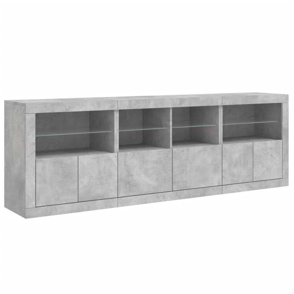 Dekoriere dein Zuhause mit diesem modernen Sideboard mit LED-Beleuchtung, das sich leicht mit Möbeln in jedem Stil kombinieren lässt. Langlebiges Material: Der Holzwerkstoff ist von außergewöhnlicher Qualität mit glatter Oberfläche und zeichnet sich außerdem durch Festigkeit, Stabilität und Widerstandsfähigkeit gegen Feuchtigkeit aus.RGB-LED-Lichter: Das Buffet ist mit leuchtenden RGB-LED-Leuchten ausgestattet. Mit verschiedenen anpassbaren Menüs kannst du die Farbe der Lichter mühelos ändern und sie sogar so einstellen, dass sie sich automatisch anpassen. Diese LED-Leuchten unterstreichen nicht nur den modernen Look des Sideboards, sondern tragen auch zu seiner trendigen Ausstrahlung bei.Ausreichend Stauraum: Der Aufbewahrungsschrank bietet viel Platz, um deine alltäglichen Dinge übersichtlich und leicht zugänglich aufzubewahren.Präsentationsfunktion: Die robuste Oberseite des Flurschranks eignet sich ideal zum Ausstellen von Dekorationsgegenständen, Bilderrahmen oder Topfpflanzen.Praktische Türen: Verstecke deine Utensilien hinter den Türen des Seitenschranks, um sie vor Staub zu schützen. Gut zu wissen:Das Produkt verfügt über einen USB-Anschluss, für den eine zertifizierte 5V-USB-Stromquelle erforderlich ist (nicht im Lieferumfang enthalten). Achtung:Um ein Umkippen zu vermeiden, sollte dieses Produkt mit der mitgelieferten Wandhalterung gesichert werden.