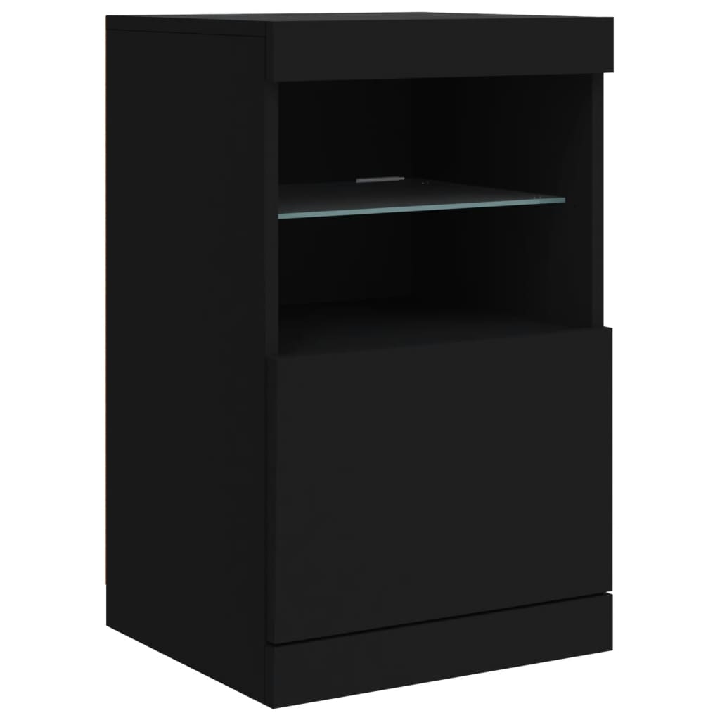 Dekoriere dein Zuhause mit diesem modernen Sideboard mit LED-Beleuchtung, das sich leicht mit Möbeln in jedem Stil kombinieren lässt. Langlebiges Material: Der Holzwerkstoff ist von außergewöhnlicher Qualität mit glatter Oberfläche und zeichnet sich außerdem durch Festigkeit, Stabilität und Widerstandsfähigkeit gegen Feuchtigkeit aus.RGB-LED-Lichter: Das Buffet ist mit leuchtenden RGB-LED-Leuchten ausgestattet. Mit verschiedenen anpassbaren Menüs kannst du die Farbe der Lichter mühelos ändern und sie sogar so einstellen, dass sie sich automatisch anpassen. Diese LED-Leuchten unterstreichen nicht nur den modernen Look des Sideboards, sondern tragen auch zu seiner trendigen Ausstrahlung bei.Ausreichend Stauraum: Der Aufbewahrungsschrank bietet viel Platz, um deine alltäglichen Dinge übersichtlich und leicht zugänglich aufzubewahren.Präsentationsfunktion: Die robuste Oberseite des Flurschranks eignet sich ideal zum Ausstellen von Dekorationsgegenständen, Bilderrahmen oder Topfpflanzen.Praktische Türen: Verstecke deine Utensilien hinter den Türen des Seitenschranks, um sie vor Staub zu schützen. Gut zu wissen:Das Produkt verfügt über einen USB-Anschluss, für den eine zertifizierte 5V-USB-Stromquelle erforderlich ist (nicht im Lieferumfang enthalten). Achtung:Um ein Umkippen zu vermeiden, sollte dieses Produkt mit der mitgelieferten Wandhalterung gesichert werden.