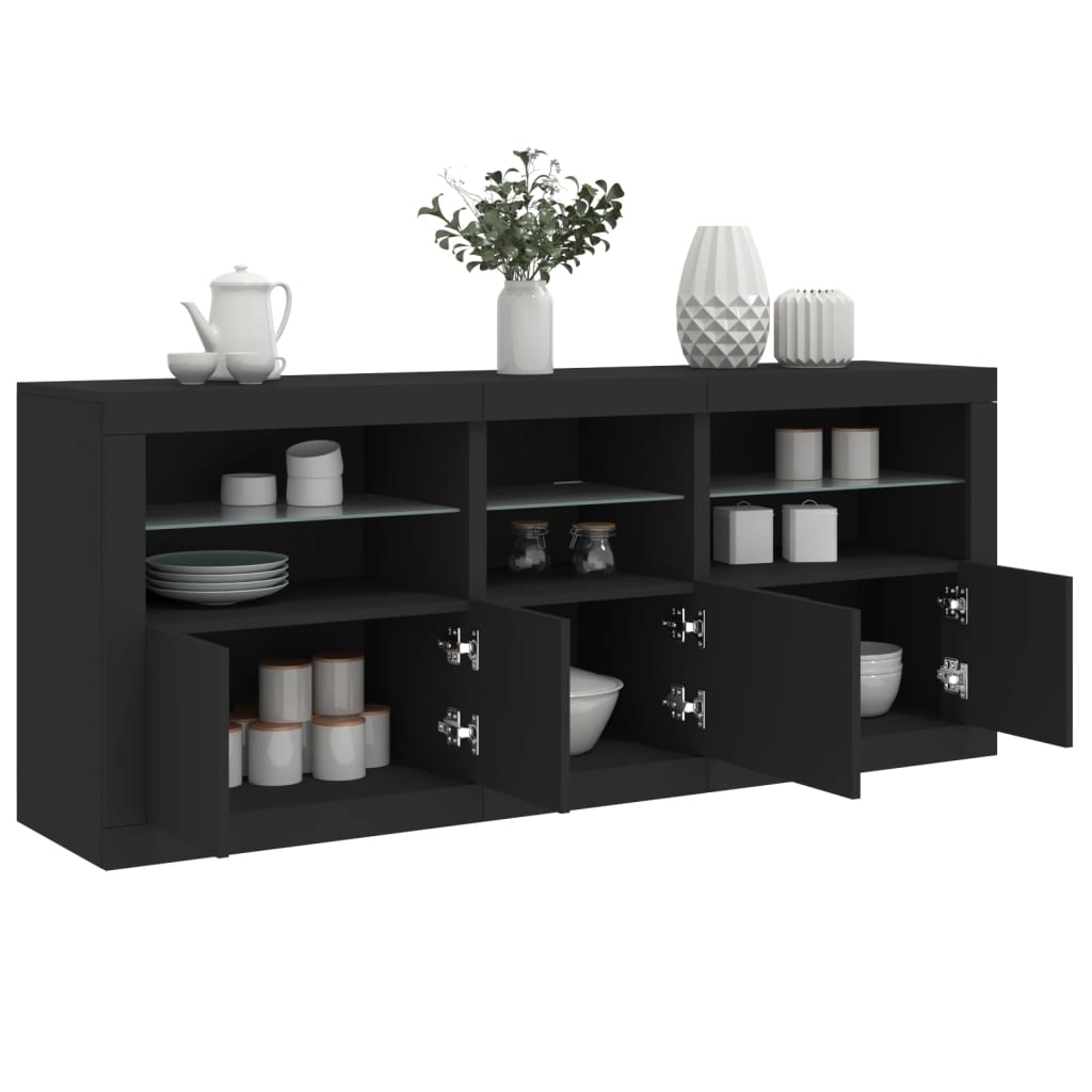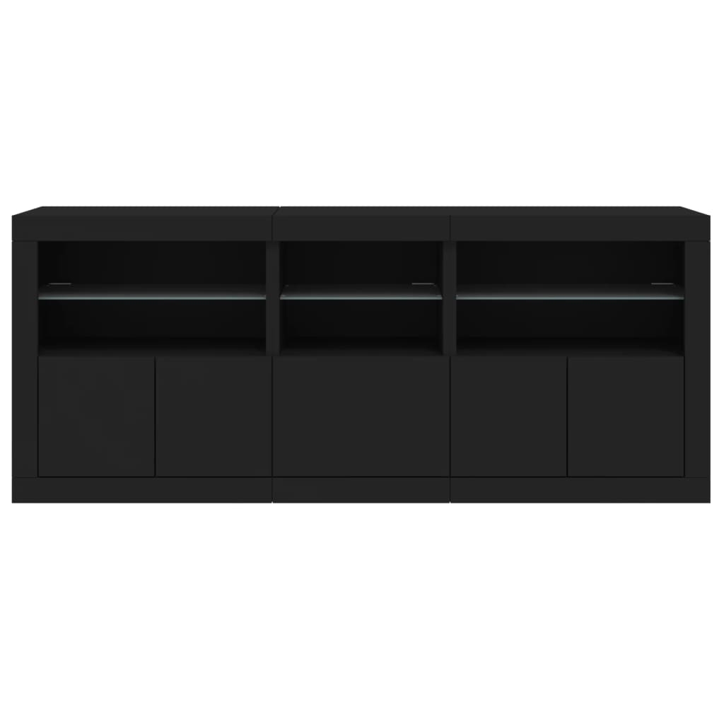 Dekoriere deinen Raum mit diesem modernen Sideboard mit LED-Leuchten, das sich leicht mit Möbeln in jedem Stil in deinem Zuhause kombinieren lässt. Langlebiges Material: Holzwerkstoff ist ein Material von außergewöhnlicher Qualität mit glatter Oberfläche, das sich durch Festigkeit, Stabilität und Feuchtigkeitsbeständigkeit auszeichnet.RGB-LED-Leuchten: Die Anrichte ist mit lebendigen RGB-LED-Leuchten ausgestattet. Mit verschiedenen anpassbaren Menüs kannst du die Farbe der Lichter mühelos wechseln und sie sogar auf automatische Anpassung einstellen. Die LED-Beleuchtung unterstreicht den modernen Look des Sideboards und trägt zu seinem trendigen Design bei.Viel Stauraum: Der Beistellschrank bietet viel Stauraum, um verschiedene Alltagssachen ordentlich und griffbereit aufzubewahren.Präsentation: Die stabile Oberplatte des Flurschranks eignet sich ideal, um Dekoartikel, Bilderrahmen oder Topfpflanzen zur Schau zu stellen.Praktische Türen: Schütze deine wichtigsten Sachen vor Staub, indem du sie hinter den Türen in diesem Beistellschrank verstaust. Gut zu wissen:Das Produkt verfügt über einen USB-Anschluss, für den eine zertifizierte 5V-USB-Stromquelle erforderlich ist (nicht im Lieferumfang enthalten). Achtung:Um ein Umkippen zu vermeiden, sollte dieses Produkt mit der mitgelieferten Wandhalterung gesichert werden.