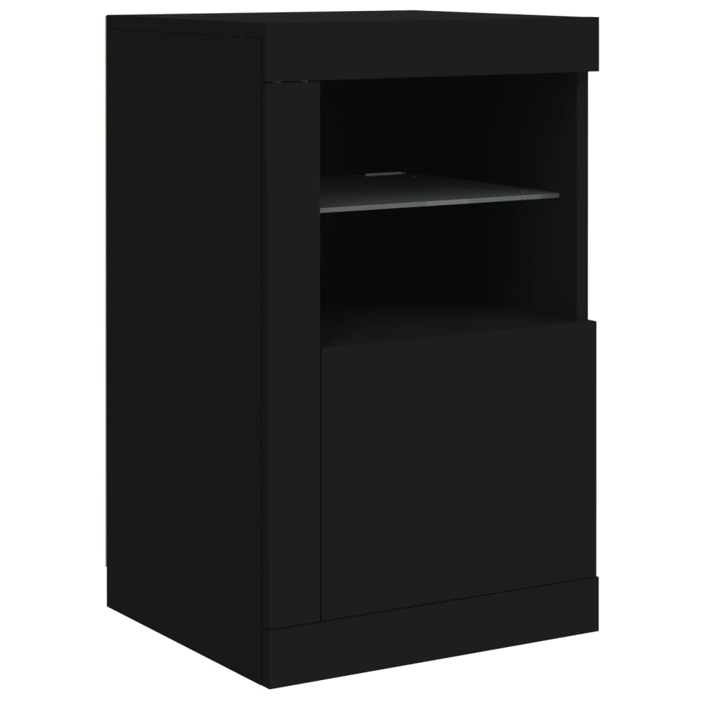 Dekoriere dein Zuhause mit diesem modernen Sideboard mit LED-Beleuchtung, das sich leicht mit Möbeln in jedem Stil kombinieren lässt. Langlebiges Material: Der Holzwerkstoff ist von außergewöhnlicher Qualität mit glatter Oberfläche und zeichnet sich außerdem durch Festigkeit, Stabilität und Widerstandsfähigkeit gegen Feuchtigkeit aus.RGB-LED-Lichter: Das Buffet ist mit leuchtenden RGB-LED-Leuchten ausgestattet. Mit verschiedenen anpassbaren Menüs kannst du die Farbe der Lichter mühelos ändern und sie sogar so einstellen, dass sie sich automatisch anpassen. Diese LED-Leuchten unterstreichen nicht nur den modernen Look des Sideboards, sondern tragen auch zu seiner trendigen Ausstrahlung bei.Ausreichend Stauraum: Der Aufbewahrungsschrank bietet viel Platz, um deine alltäglichen Dinge übersichtlich und leicht zugänglich aufzubewahren.Präsentationsfunktion: Die robuste Oberseite des Flurschranks eignet sich ideal zum Ausstellen von Dekorationsgegenständen, Bilderrahmen oder Topfpflanzen.Praktische Türen: Verstecke deine Utensilien hinter den Türen des Seitenschranks, um sie vor Staub zu schützen. Gut zu wissen:Das Produkt verfügt über einen USB-Anschluss, für den eine zertifizierte 5V-USB-Stromquelle erforderlich ist (nicht im Lieferumfang enthalten). Achtung:Um ein Umkippen zu vermeiden, sollte dieses Produkt mit der mitgelieferten Wandhalterung gesichert werden.