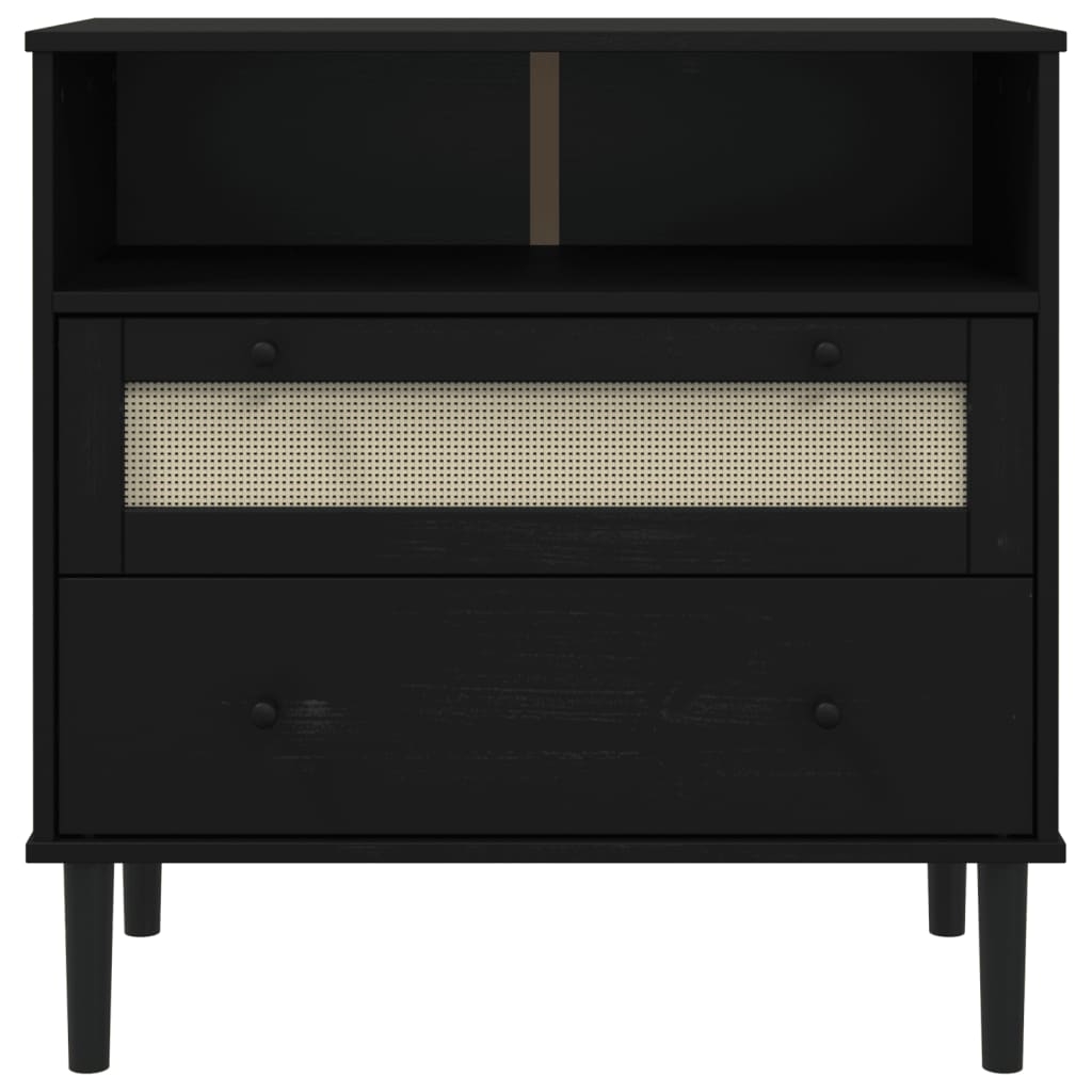Mit seinem minimalistischen Design wird dieses Sideboard aus Holz deinen unterschiedlichen Bedürfnissen gerecht und verleiht deinem Zimmer einen einzigartigen Look. Massives Kiefernholz: Massives Kiefernholz ist ein wunderschönes Naturmaterial. Kiefernholz weist eine gerade Maserung auf und die Aststellen verleihen dem Material seine charakteristische, rustikale Optik.UV-Lackierung: UV-Lackierung ist eine spezielle Art von Lackierung, die mittels einer UV-Trocknungsanlage aufgetragen wird. Im Vergleich zu anderen Lackierungen sorgt sie für eine lebendigere, luxuriösere und taktilere Oberflächenbearbeitung.Viel Stauraum: Dieser Beistellschrank verfügt über 2 Schubladen und 1 Fach und bietet reichlich Stauraum, um deine Zeitschriften, Bücher, DVDs, Multimediageräte und andere wichtige Sachen gut organisiert und griffbereit aufzubewahren.Rattan-Optik: Die Front der oberen Schublade ist aus Poly Rattan handgefertigt, wodurch Mid-Century Modernismus mit Boho-Stil kombiniert werden, um deinem Interieur eine einladende und dennoch stilvolle Note zu verleihen.Stabile Oberplatte: Die stabile Oberseite eignet sich perfekt zum Aufstellen von Topfpflanzen, Fotorahmen und anderen Dekorationsgegenständen. Achtung:Um ein Umkippen zu vermeiden, sollte dieses Produkt mit der mitgelieferten Wandhalterung gesichert werden.