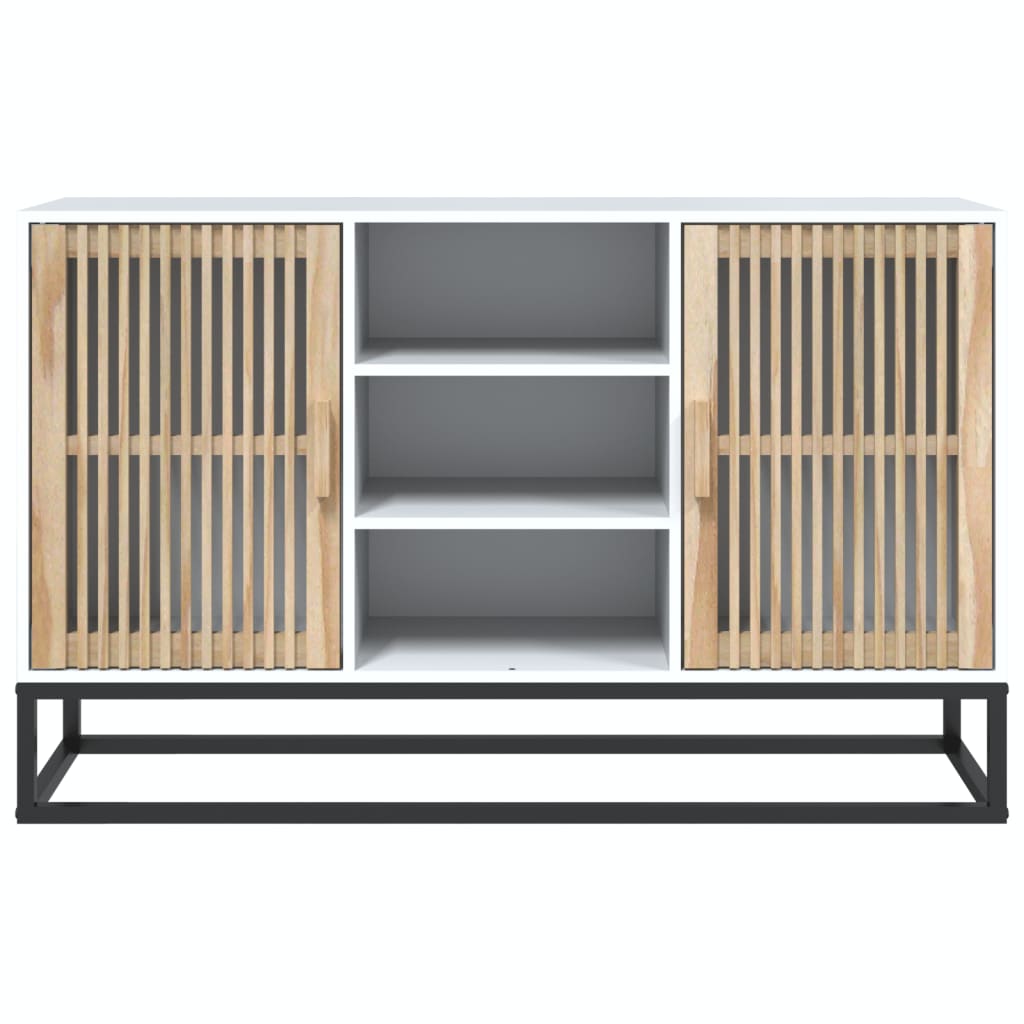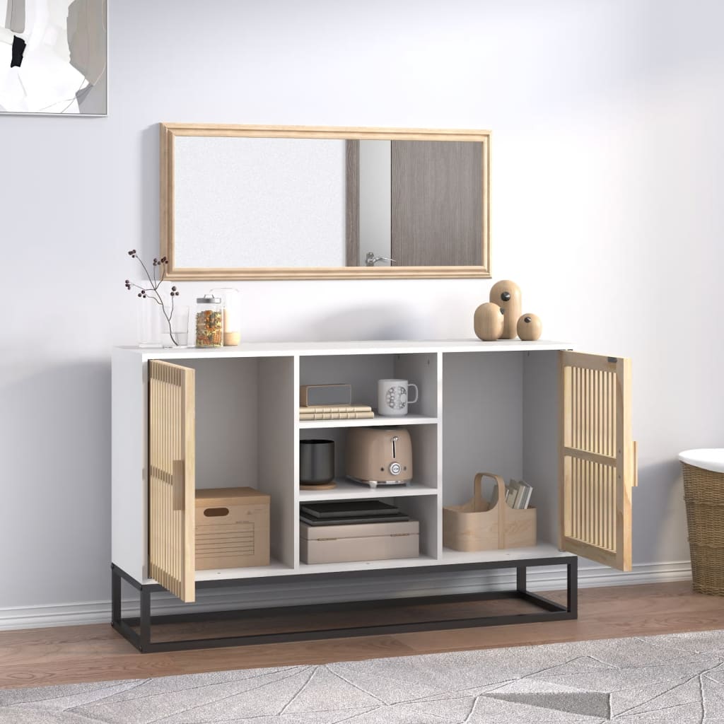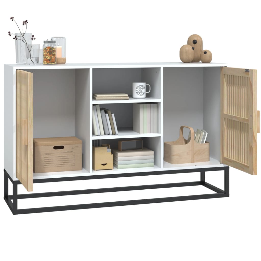 Mit seinem zeitlosen Design ist dieses klassische Sideboard eine ausgezeichnete Bereicherung für Ihr Zuhause. Langlebiges Material: Holzwerkstoff ist ein Material von außergewöhnlicher Qualität mit glatter Oberfläche, das sich durch Festigkeit, Stabilität und Feuchtigkeitsbeständigkeit auszeichnet.Viel Stauraum: Das Sideboard bietet viel Platz, um verschiedene Alltagssachen gut organisiert und in Reichweite aufzubewahren.Holztür: Der Schrank verfügt über Holztüren, die deine Sachen vor Staub und Schmutz zu schützen.Stabiles Eisenbein: Das Eisenbein sorgt für Robustheit und Stabilität.Präsentation: Du kannst auch deine Lieblingsfotos, Dekoartikel oder Topfpflanzen auf der Oberplatte des Schrankes zur Schau stellen, um deinen Wohnraum schöner zu gestalten. Gut zu wissen:Um die Montage so einfach wie möglich zu machen, wird jedes Produkt mit einer Anleitung geliefert. Achtung:Um ein Umkippen zu vermeiden, sollte dieses Produkt mit der mitgelieferten Wandhalterung gesichert werden.