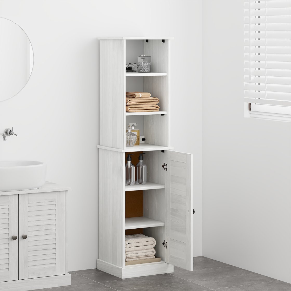 Dieses Regal bringt funktionalen Charme in jedes Badezimmer mit seinem rustikalen Flair. Es hat eine stabile Konstruktion aus Kiefernholz, die einladend aussieht und als praktische Stauraumlösung funktioniert. Mit einem Mix aus Vintage-Charme und modernem Twist passt dieser Schrank perfekt in Räume, die ein wenig Ordnung gebrauchen können, ohne den Stil zu verlieren. Die rechteckige Form und die geräumigen Regale sind ideal, um Handtücher, Toilettenartikel oder Deko ordentlich zu verstauen. Massivholz Kiefer: Aus hochwertigem, solidem Kiefernholz hergestellt, hält dieser Schrank lange. Das tolle Gefühl des Holzes bringt einen Hauch von natürlicher Schönheit mit und macht ihn zu einer zeitlosen Wahl für jeden Raum. Kiefernholz ist bekannt dafür, lange zu halten und sieht auch nach Jahren noch gut aus – ein beruhigendes Gefühl für Hausbesitzer, die auf zuverlässige Möbel setzen möchten. Brett-Regale: Die einfachen Brett-Regale erhöhen den Stauraum und sehen dabei schick aus. Sie helfen, Badezimmer-Essentials ordentlich und sauber zu halten. Sie passen zu verschiedenen Umgebungen und können sich an alle möglichen Speicherbedürfnisse anpassen, von schweren Sachen bis hin zu zarten Ausstellungsstücken. Tür mit Scharnieren: Mit praktischen Türen mit Scharnieren hast du einfachen Zugriff auf deine Sachen. Sie öffnen sich leicht und schließen sicher, sodass alles abgedeckt und staubfrei bleibt. Die Türen tragen mit ihrem klassischen Design zur zeitlosen Anziehungskraft des Schranks bei. Rustikales Finish: Das rustikale Finish macht den Schrank zu einem einzigartigen Hingucker mit gealtertem Look. Mit seinem rauen, abgenutzten Erscheinungsbild bringt es Charakter und Charm in dein Zuhause und passt perfekt zu verschiedenen Einrichtungsstilen. Der rustikale Stil strahlt Wärme und Komfort aus und macht ihn zu einem einladenden Blickfang in jedem Badezimmer. Einfache Pflegehinweise: Es ist ganz einfach, diesen Schrank gut aussehen zu lassen. Staub ihn regelmäßig mit einem trockenen Tuch ab, damit er seine natürliche Schönheit behält und über die Jahre ein geschätztes Möbelstück bleibt.
