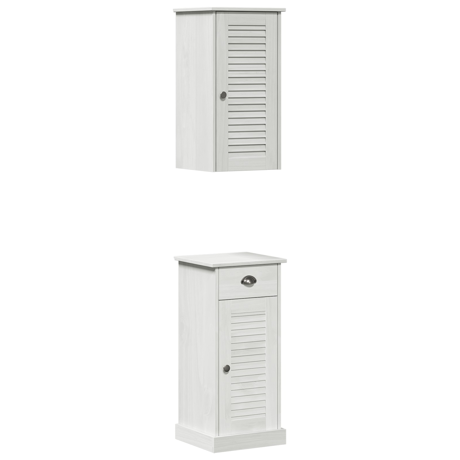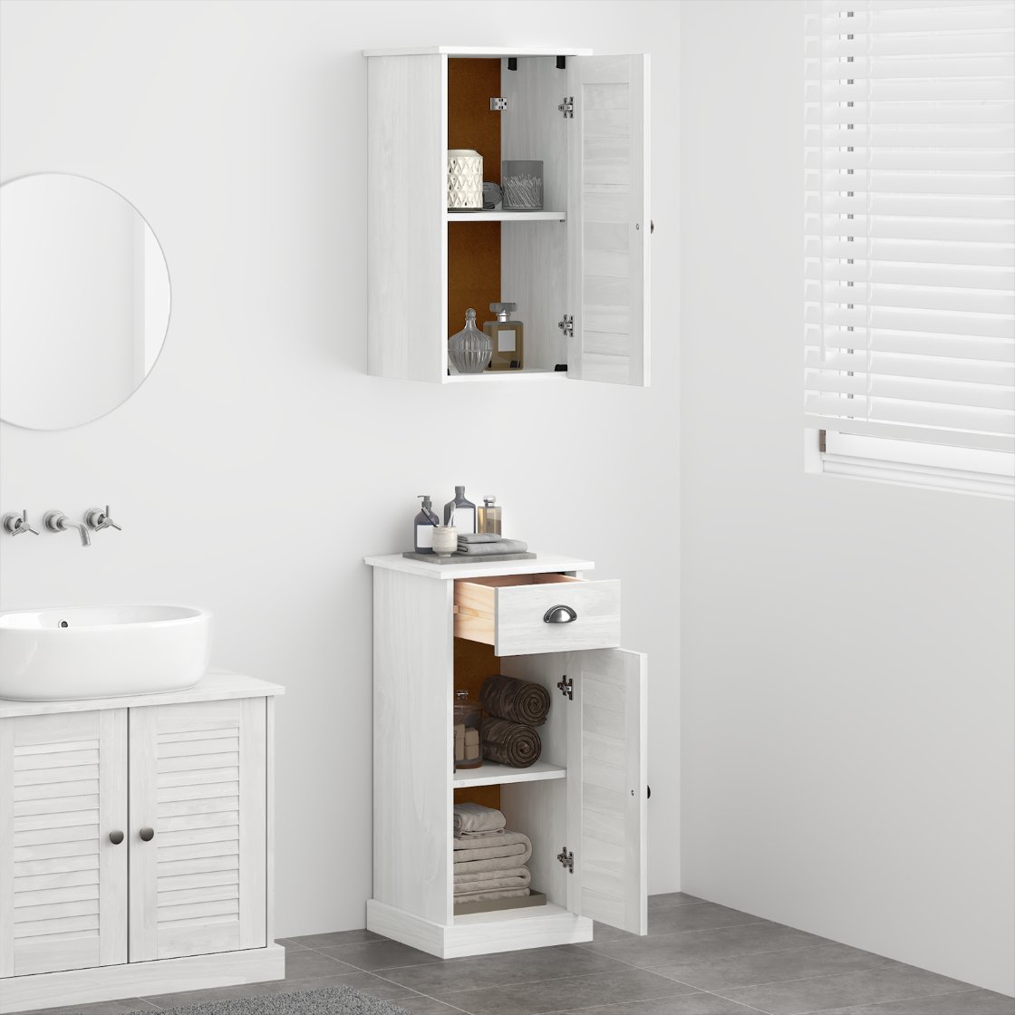 Dieser rustikale Badezimmer-Schrank bietet dir ein klassisches, praktisches Design, das genau richtig ist, um deine Badezimmerartikel unterzubringen. Seine rechteckige Form und das rustikale Flair machen ihn zu einer super Wahl für Räume, die einen natürlichen, robusten Look lieben. Dieses Möbelstück punktet sowohl in der Optik als auch in der Funktionalität und bringt Charme in dein Badezimmer. Ideal für jeden, der eine Kombination aus Stil und Praktikabilität mag, fügt er sich ganz locker in andere rustikale Einrichtungsstile ein. Materialien: Dieser Schrank ist aus massivem Kiefernholz gefertigt, was ihm Stärke und Langlebigkeit verleiht und gleichzeitig das rustikale Flair deines Badezimmers unterstreicht. Die Kombination aus Holz und Metall gibt ihm einen stabilen Halt und einen zeitlosen Look, sodass er zu unterschiedlichen Einrichtungsstilen passt. Enthaltene Komponenten: Er kommt mit traditionellen Schubladen, die leicht zu greifen sind, dank der Griffe oder Knöpfe, und mit Türen, die eine tolle Mischung aus offenem und geschlossenem Stauraum bieten. Dieses Setup sorgt dafür, dass du deine Badezimmerartikel ordentlich verstauen kannst. Eigenschaften / Funktion / Design: Die Metallknöpfe geben den rustikalen Charme und sind sowohl praktisch als auch stylisch. Der Schrank bietet eine gute Balance zwischen Funktionalität und Aussehen und ist eine solide Wahl für alle, die sowohl Praktikabilität als auch Eleganz in ihrem Badezimmerstauraum suchen. Empfohlene Verwendung: Er ist für den Innengebrauch im Badezimmer gedacht und bietet Platz für alle Arten von Toilettenartikeln und Zubehör. Seine Größe und Form machen ihn ideal für kleinere Räume, wo du clevere Stauraumlösungen brauchst, um den Überblick zu behalten. Pflege & Wartung: Achte darauf, den Schrank an der Wand zu befestigen, um ein Umkippen zu verhindern. Wische ihn regelmäßig mit einem feuchten Tuch ab, damit er staubfrei bleibt. Vermeide aggressive Chemikalien oder Scheuermittel, damit das Holz und Metall lange schön bleiben.