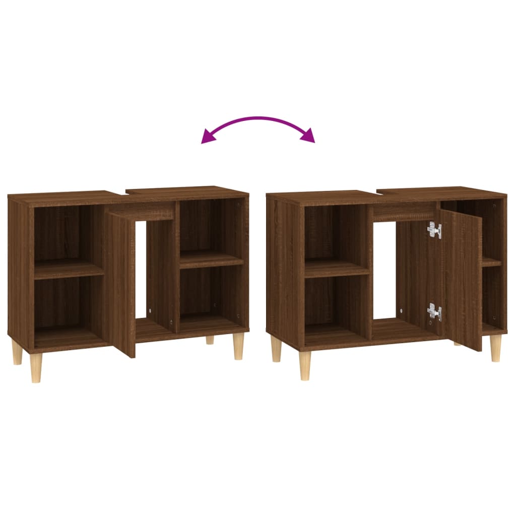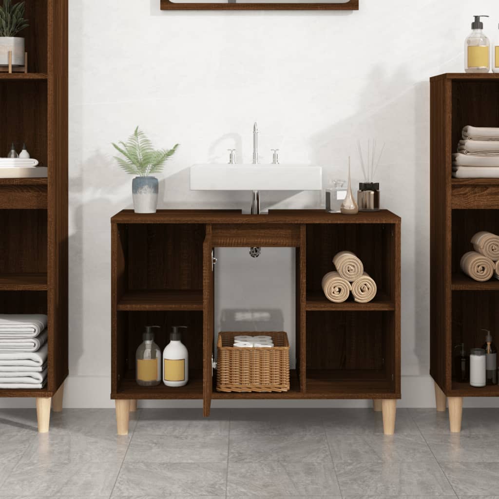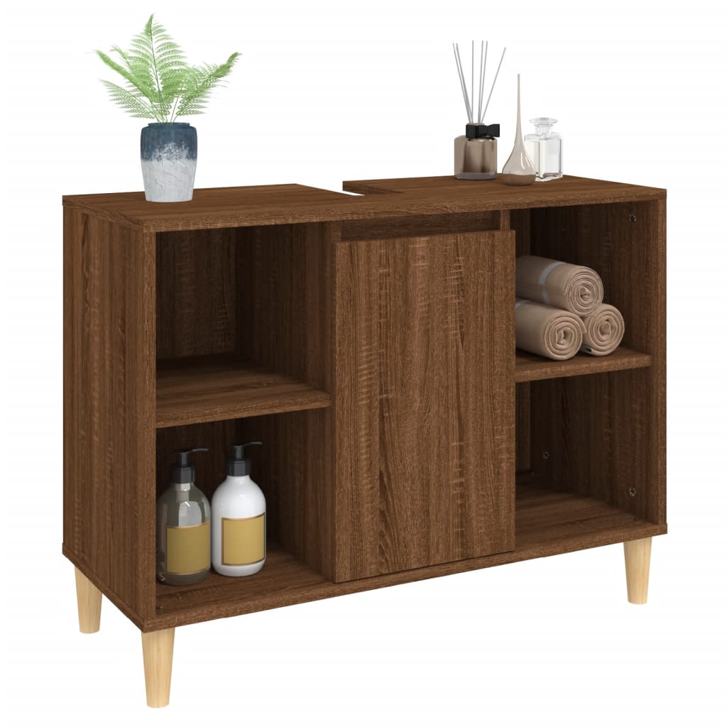 Dieser Waschbeckenunterschrank ist eine großartige Bereicherung für dein Badezimmer und verleiht ihm ein ordentliches und auffälliges Aussehen! Langlebiges Material: Holzwerkstoff ist ein Material von außergewöhnlicher Qualität mit glatter Oberfläche, das sich durch Festigkeit, Stabilität und Feuchtigkeitsbeständigkeit auszeichnet.Viel Stauraum: Der Waschbeckenschrank verfügt über 5 Fächer und eine Tür, die verschiedene Aufbewahrungsmöglichkeiten und zusätzlichen Platz zum Verstauen von Gegenständen in deinem Badezimmer bieten. Die Oberseite des Unterschranks ist ideal für die Platzierung des Waschbeckens.Holzbeine: Die Beine aus massivem Eukalyptusholz verleihen dem Badschrank eine natürliche und angenehme Optik und sorgen gleichzeitig für Stabilität.Einfache Reinigung: Die Badezimmermöbel lassen sich leicht mit einem feuchten Tuch reinigen. Achtung:Um ein Umkippen zu vermeiden, sollte dieses Produkt mit der mitgelieferten Wandhalterung gesichert werden. Gut zu wissen:Um die Montage so einfach wie möglich zu machen, wird jedes Produkt mit einer Anleitung geliefert.Das Waschbecken ist nicht im Lieferumfang enthalten.