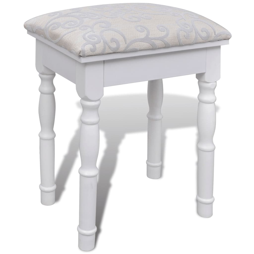 Dieser charmante Schminktisch und Hocker sind aus hochwertigem Kiefernholz gefertigt. Sein viktorianischer Stil und seine saubere, weiße Farbe bringen Eleganz und Schönheit in Ihr Schlaf- oder Ankleidezimmer. Das Schminktisch-Set zeichnet sich durch eine exquisite Verarbeitung aus. Der 3-in-1-Tischspiegel, von dem 2 Seitenspiegel mit dem Hauptspiegel über stabile Scharniere verbunden sind, kann platzsparend zusammengeklappt werden. Die Seitenspiegel lassen sich in die von Ihnen gewünschten Winkel drehen. Als nette Überraschung gilt, dass der Spiegelrahmen und der Tisch voneinander getrennt verwendet werden können. Zwei schicke Schubladen bieten Ihnen zusätzlichen Platz für Ihren Schmuck, Kosmetika und andere Wertsachen. Dieser Frisiertisch mit Hocker wird überall zum Hingucker. Der Zusammenbau ist recht einfach mit dem im Lieferumfang enthaltenen Montagesatz.