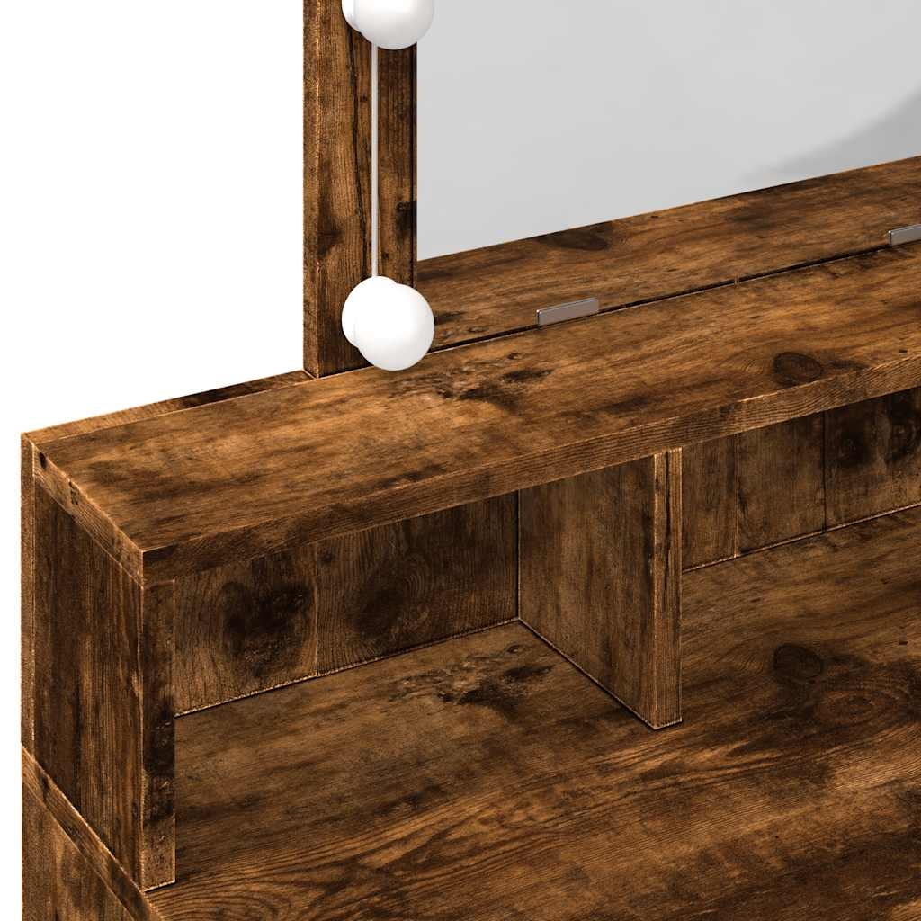 Dieser Schminktisch ist eine großartige Ergänzung zu deinem Schlafzimmer und bietet auch Platz zur griffbereiten Aufbewahrung deiner Kosmetika! Starkes und langlebiges Material: Holzwerkstoff ist ein langlebiges und robustes Material mit einer glatten Oberfläche, das gegen Feuchtigkeit, Verformung und Rissbildung beständig ist, wodurch es eine zuverlässigen Wahl für die Herstellung von Möbeln ist.Viel Stauraum: Der Schminktisch mit 2 Schubladen und 3 Fächern bietet viel Platz, um verschiedene Alltagssachen gut organisiert und in Reichweite aufzubewahren.Allzweckspiegel: Der schöne Spiegel bietet eine klare Sicht beim Auftragen von Make-up und verleiht dem Schminktisch eine elegante Note.LED-Leuchten: Der Schminktisch verfügt auch über LED-Leuchten mit USB, die einfach von Warmweiß auf Kaltweiß umgeschaltet werden können. Dabei beleuchten die LED-Lampen rund um den Spiegel dein Gesicht optimal. Achtung:Um ein Umkippen zu vermeiden, sollte dieses Produkt mit der mitgelieferten Wandhalterung gesichert werden.