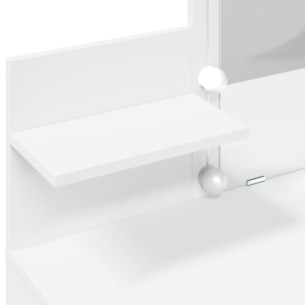 Dieser Schminktisch ist eine großartige Ergänzung zu deinem Schlafzimmer und bietet auch Platz zur griffbereiten Aufbewahrung deiner Kosmetika! Starkes und langlebiges Material: Holzwerkstoff ist ein langlebiges und robustes Material mit einer glatten Oberfläche, das gegen Feuchtigkeit, Verformung und Rissbildung beständig ist, wodurch es eine zuverlässigen Wahl für die Herstellung von Möbeln ist.Viel Stauraum: Der Schminktisch mit 2 Schubladen und 2 Ablagen bietet viel Platz, um verschiedene Alltagssachen gut organisiert und in Reichweite aufzubewahren.Allzweckspiegel: Der schöne Spiegel bietet eine klare Sicht beim Auftragen von Make-up und verleiht dem Schminktisch eine elegante Note.LED-Leuchten: Der Schminktisch verfügt auch über LED-Leuchten mit USB, die einfach von Warmweiß auf Kaltweiß umgeschaltet werden können. Dabei beleuchten die LED-Lampen rund um den Spiegel dein Gesicht optimal. Achtung:Um ein Umkippen zu vermeiden, sollte dieses Produkt mit der mitgelieferten Wandhalterung gesichert werden.