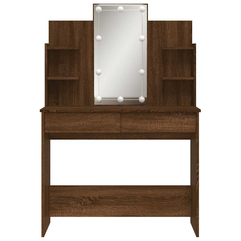 Mit seinem zeitlosen und eleganten Design ist dieser Schminktisch mit Spiegel und LED-Beleuchtung eine großartige Ergänzung zu deiner Schlafzimmereinrichtung und bietet auch Platz zur griffbereiten Aufbewahrung deiner Kosmetika! Robustes Material: Holzwerkstoff ist ein Material hoher Qualität mit glatter Oberfläche, das sich durch Festigkeit, Stabilität und Feuchtigkeitsbeständigkeit auszeichnet. Aus Holzwerkstoff gefertigt, lässt sich dieser Schminktisch einfach reinigen.Reichlich Stauraum: Dieser Frisiertisch verfügt über 2 Schubladen und 4 kleine Ablageflächen, die reichlich Platz bieten, um deine Kosmetika ordentlich aufzubewahren.Allzweckspiegel: Der mitgelieferte schöne Spiegel bietet eine klare Sicht beim Auftragen von Make-up und verleiht dem Schminktisch eine elegante Note.Einstellbare LED-Leuchten: Dieser Schmucktisch verfügt über LED-Leuchten rund um den Spiegel. Du kannst ganz einfach zwischen 3 Lichtfarben (kalt, warm und neutral) wechseln und die Helligkeit mit dem praktischen Regler einstellen. AchtungUm das Umkippen zu verhindern, muss dieses Produkt mit der mitgelieferten Wandhalterung gesichert werden. Gut zu wissen:Das Produkt verfügt über einen USB-Anschluss, aber die zertifizierte 5-V-USB-Stromquelle ist nicht im Lieferumfang enthalten.