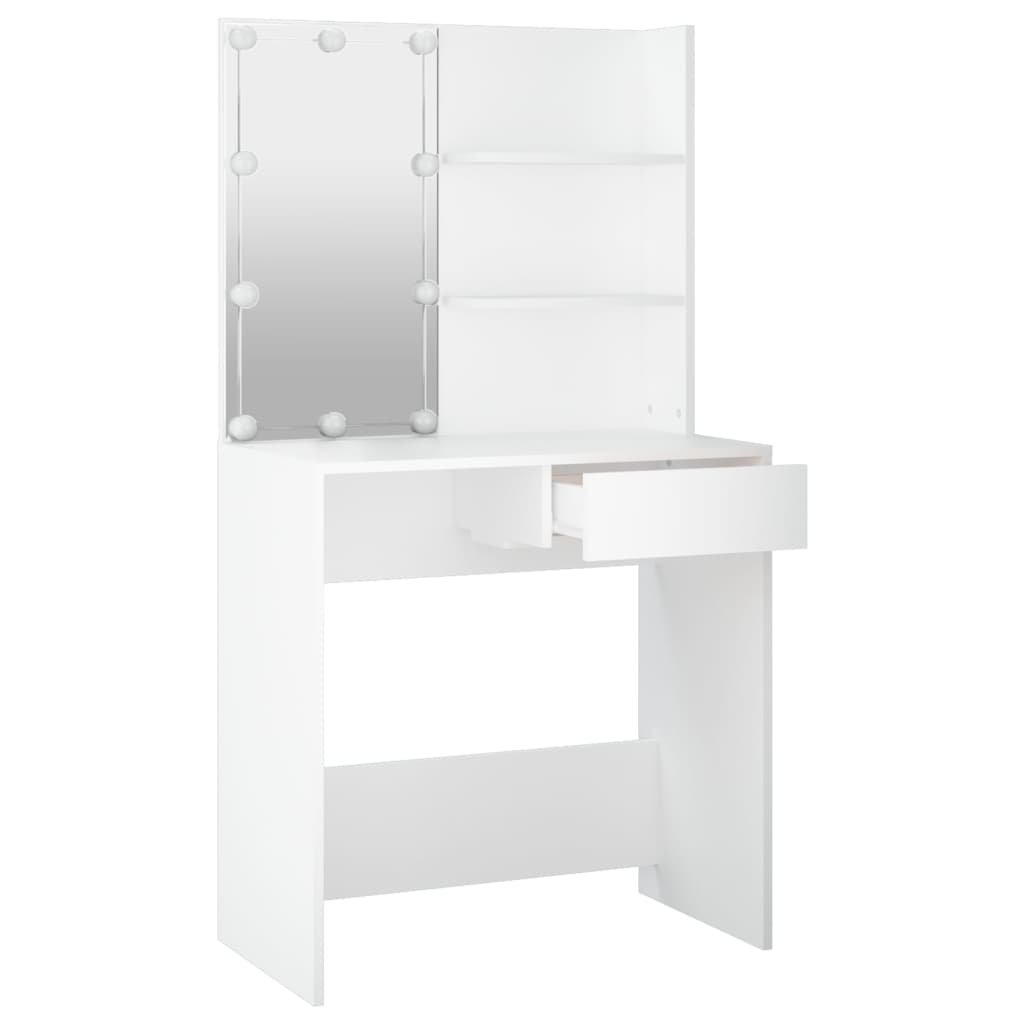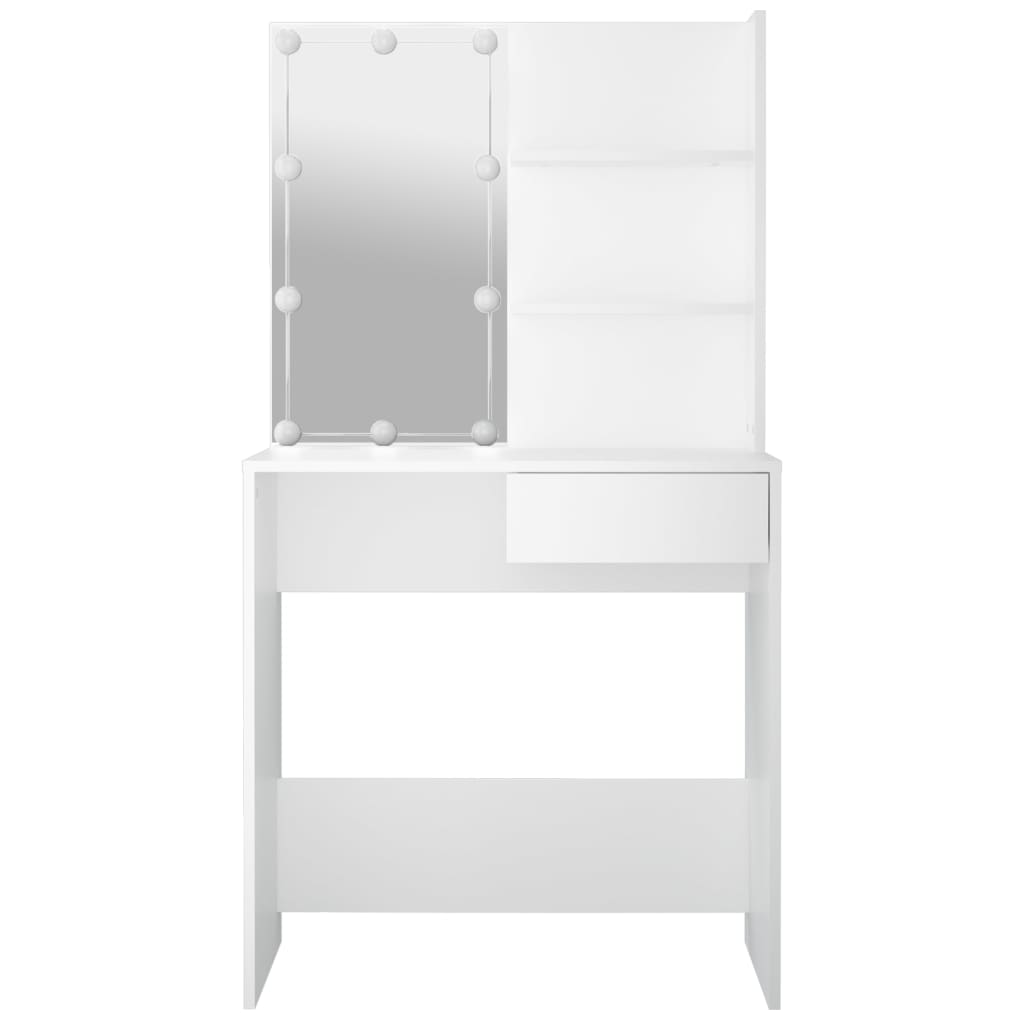 Mit seinen raffinierten geraden Linien und seiner asymmetrischen Form voller Einzigartigkeit wird dieser Schminktisch mit Sicherheit alle Blicke auf sich ziehen! Langlebiges Material: Holzwerkstoff ist ein Material von außergewöhnlicher Qualität mit glatter Oberfläche, das sich durch Festigkeit, Stabilität und Feuchtigkeitsbeständigkeit auszeichnet.LED-Leuchten: Der Kosmetiktisch verfügt auch über LED-Lampen mit USB, die einfach von Warmweiß auf Kaltweiß umgeschaltet werden können. Dabei beleuchten die LED-Lampen rund um den Spiegel dein Gesicht optimal.Viel Stauraum: Der Schminktisch verfügt über eine Schublade zur Aufbewahrung von Accessoires sowie zwei Ablagen über dem Tisch, die Platz für alle Arten von Flaschen bieten. Warnung:Um das Umkippen zu verhindern, muss dieses Produkt mit der mitgelieferten Wandhalterung gesichert werden. Hinweis:Jedes Produkt wird mit einer Montageanleitung in der Verpackung für eine einfache Montage geliefert.