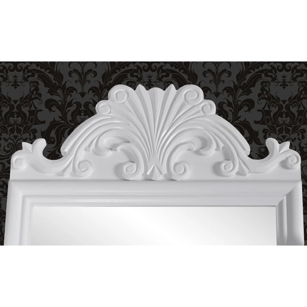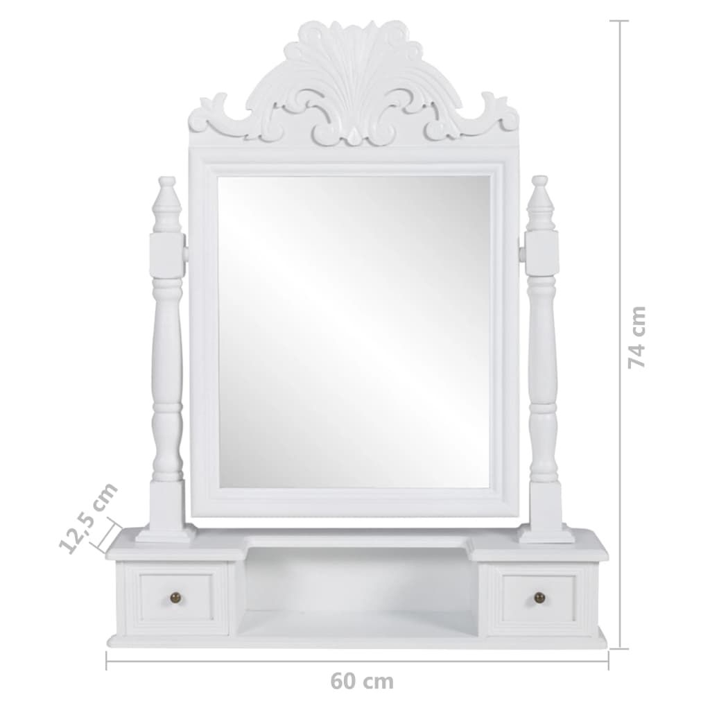 Dieser wunderschön verarbeitete Schminktisch ist mit aufwendigen Details versehen. Die Verarbeitung verleiht ihm ein klassisch-elegantes Aussehen.Ein stilvoller quadratischer Spiegel ist in der Mitte angebracht. Dieser kann bei Bedarf geschwenkt werden. Das Unterteil enthält zwei kleine Schubladen, in denen Sie Ihre Wertsachen aufbewahren können. Dieser Schminktisch-Aufsatz ist aus hochwertigem MDF gefertigt. Er kann auf Truhen oder Tischen verwendet werden. Die Lieferung enthält 1 Schminktisch-Aufsatz mit zwei Schubladen und 1 Spiegel.Hinweis: Da diese Möbel handgefertigt, aus Holz und weiß lackiert sind, können sie kleinere Mangel aufweisen.