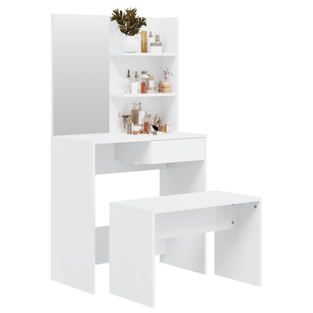 Das trendige Schminktisch-Set verleiht deinem Schlafzimmer einen stilvollen, zeitlosen Look. Der Schminktisch mit Hocker ist eine perfekte Ergänzung zu deiner Schlafzimmereinrichtung und hält auch deine Kosmetika griffbereit! Stabiles Material: Holzwerkstoff ist ein Material hoher Qualität mit glatter Oberfläche, das sich durch Festigkeit, Stabilität und Feuchtigkeitsbeständigkeit auszeichnet.Viel Stauraum: Der Schminktisch bietet reichlich Platz, um Make-up, Schmuck und Schönheitsprodukte griffbereit aufzubewahren.Spiegel: Mit einem Spiegel versehen, eignet sich der Schminktisch perfekt für deine tägliche Schönheitspflege. So kannst du deine Gesichtshaut pflegen und auch dein Make-up auftragen!Vielseitig einsetzbar: Dieses Schminktisch-Set eignet sich für verschiedene Bereiche, sei es Schlafzimmer, Ankleide oder jeden anderen Raum, in dem du es aufstellen möchtest.Modernes Design: Durch klare Linien, minimalistischen Look und modernes Design fügt er sich harmonisch in deine Inneneinrichtung ein. Warnung:Um das Umkippen zu verhindern, muss dieses Produkt mit der mitgelieferten Wandhalterung gesichert werden. Hinweis:Jedes Produkt wird mit einer Montageanleitung in der Verpackung für eine einfache Montage geliefert.