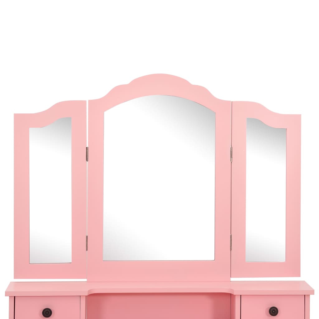 Arbeiten Sie mit unserem schicken und charmanten Schminktischset stilvoll an Ihrer Morgenroutine! Diese elegante Kommode aus ausgewähltem Paulownia-Holz besticht durch einzigartige Silhouette und vier geschwungenen Beinen in luxuriösem Stil. Vier Schubladen in verschiedenen Größen und ein offenes Fach bieten den perfekten Platz für die Aufbewahrung von Make-up und Schmuck. Die Tischplatte ist eine ausgezeichnete Fläche für die Ausstellung von Parfümflakons oder anderen Dekoartikeln. Der mitgelieferte Hocker verfügt über einen gepolsterten Sitz und ein zum Tisch passendes Holzgestell. Darüber hinaus unterstreicht der eingebaute Spiegel das zeitgemäße Flair.