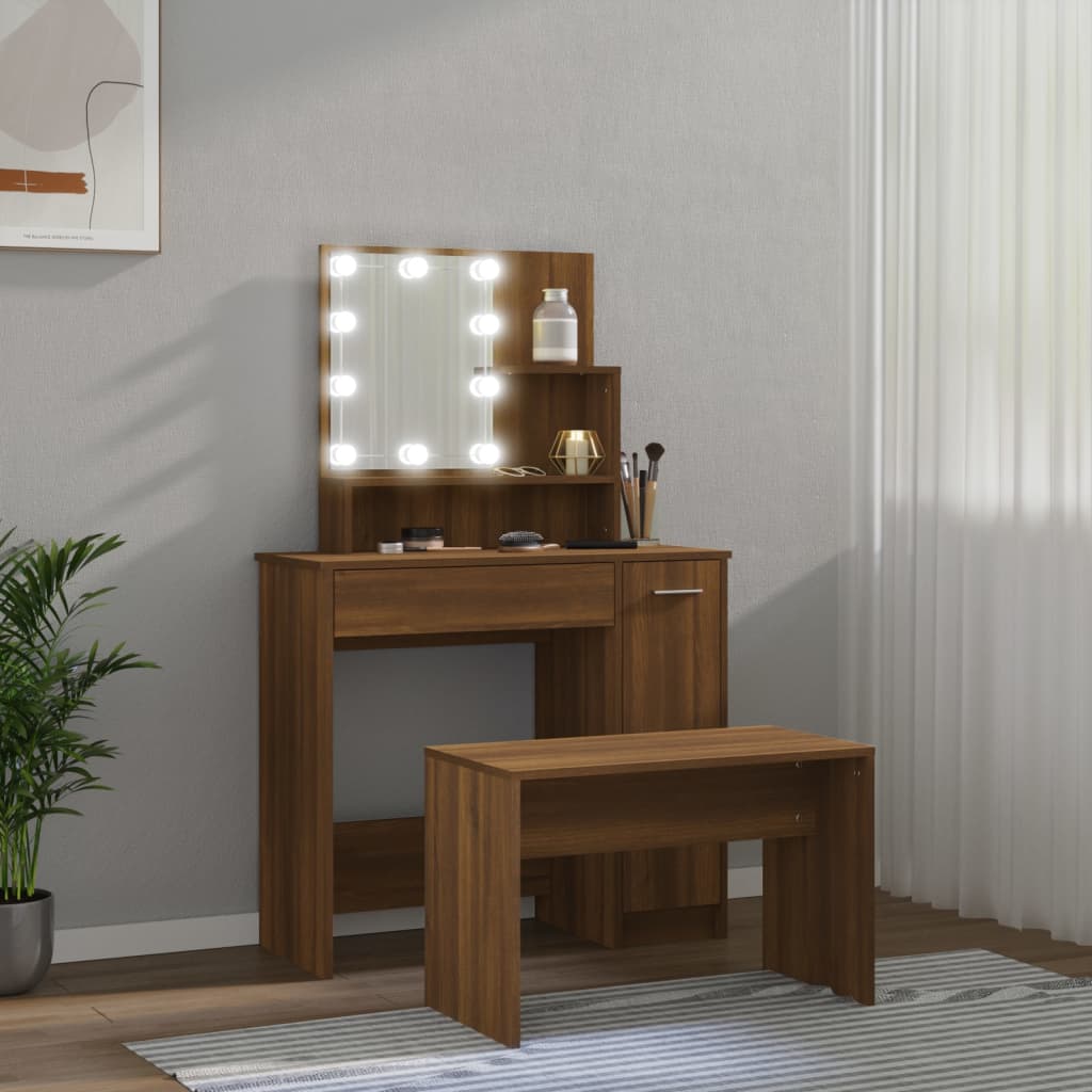 Das trendige Schminktisch-Set verleiht deinem Schlafzimmer einen zeitlosen, raffinierten Look. Das Schminktisch-Set mit LED-Beleuchtung ist eine perfekte Ergänzung für deine Schlafzimmereinrichtung und hält auch deine Kosmetika immer griffbereit! Stabiles Material: Holzwerkstoff ist ein Material hoher Qualität mit glatter Oberfläche, das sich durch Festigkeit, Stabilität und Feuchtigkeitsbeständigkeit auszeichnet.Allzweckspiegel: Der Schminktisch mit Spiegel ist perfekt für deine tägliche Schönheitsroutine. Mit dem Spiegel kannst du dein Gesicht pflegen und auch dein Make-up auftragen!Viel Stauraum: Der Schminktisch mit Hocker bietet viel Platz für einfachen Zugriff auf Make-up, Schmuck und anderen Accessoires.LED-Beleuchtung: Der Schminktisch verfügt auch über LED-Lampen mit USB, die einfach von Warmweiß auf Kaltweiß umgeschaltet werden können. Dabei beleuchten die LED-Lampen rund um den Spiegel dein Gesicht optimal.Vielseitig einsetzbar: Dieses Schminktisch-Set eignet sich für verschiedene Bereiche, sei es Schlafzimmer, Ankleide oder jeden anderen Raum, in dem du es aufstellen möchtest. Warnung:Um das Umkippen zu verhindern, muss dieses Produkt mit der mitgelieferten Wandhalterung gesichert werden. Hinweis:Jedes Produkt wird mit einer Montageanleitung in der Verpackung für eine einfache Montage geliefert.