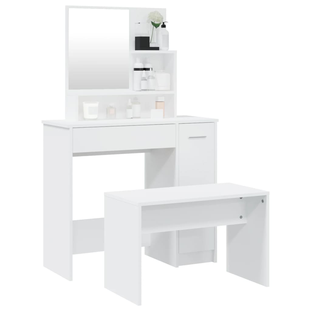 Das trendige Schminktisch-Set verleiht deinem Schlafzimmer einen stilvollen, zeitlosen Look. Der Schminktisch mit Hocker ist eine perfekte Ergänzung zu deiner Schlafzimmereinrichtung und hält auch deine Kosmetika griffbereit! Stabiles Material: Holzwerkstoff ist ein Material hoher Qualität mit glatter Oberfläche, das sich durch Festigkeit, Stabilität und Feuchtigkeitsbeständigkeit auszeichnet.Viel Stauraum: Der Schminktisch bietet reichlich Platz, um Make-up, Schmuck und Schönheitsprodukte griffbereit aufzubewahren.Spiegel: Mit einem Spiegel versehen, eignet sich der Schminktisch perfekt für deine tägliche Schönheitspflege. So kannst du deine Gesichtshaut pflegen und auch dein Make-up auftragen!Vielseitig einsetzbar: Dieses Schminktisch-Set eignet sich für verschiedene Bereiche, sei es Schlafzimmer, Ankleide oder jeden anderen Raum, in dem du es aufstellen möchtest.Modernes Design: Durch klare Linien, minimalistischen Look und modernes Design fügt er sich harmonisch in deine Inneneinrichtung ein. Warnung:Um das Umkippen zu verhindern, muss dieses Produkt mit der mitgelieferten Wandhalterung gesichert werden. Hinweis:Jedes Produkt wird mit einer Montageanleitung in der Verpackung für eine einfache Montage geliefert.
