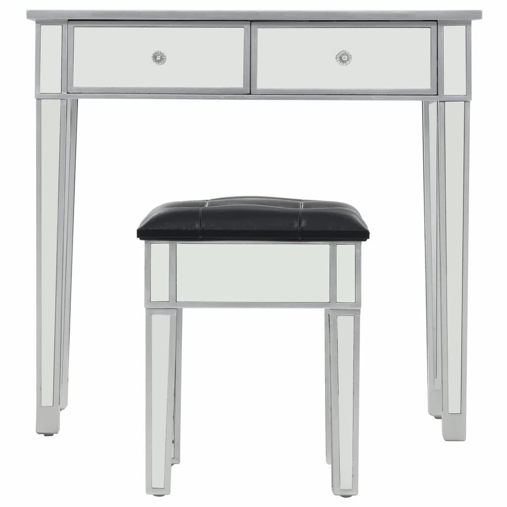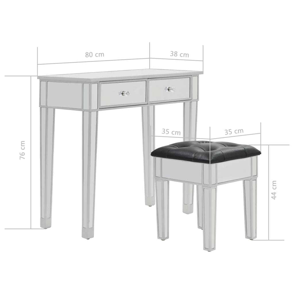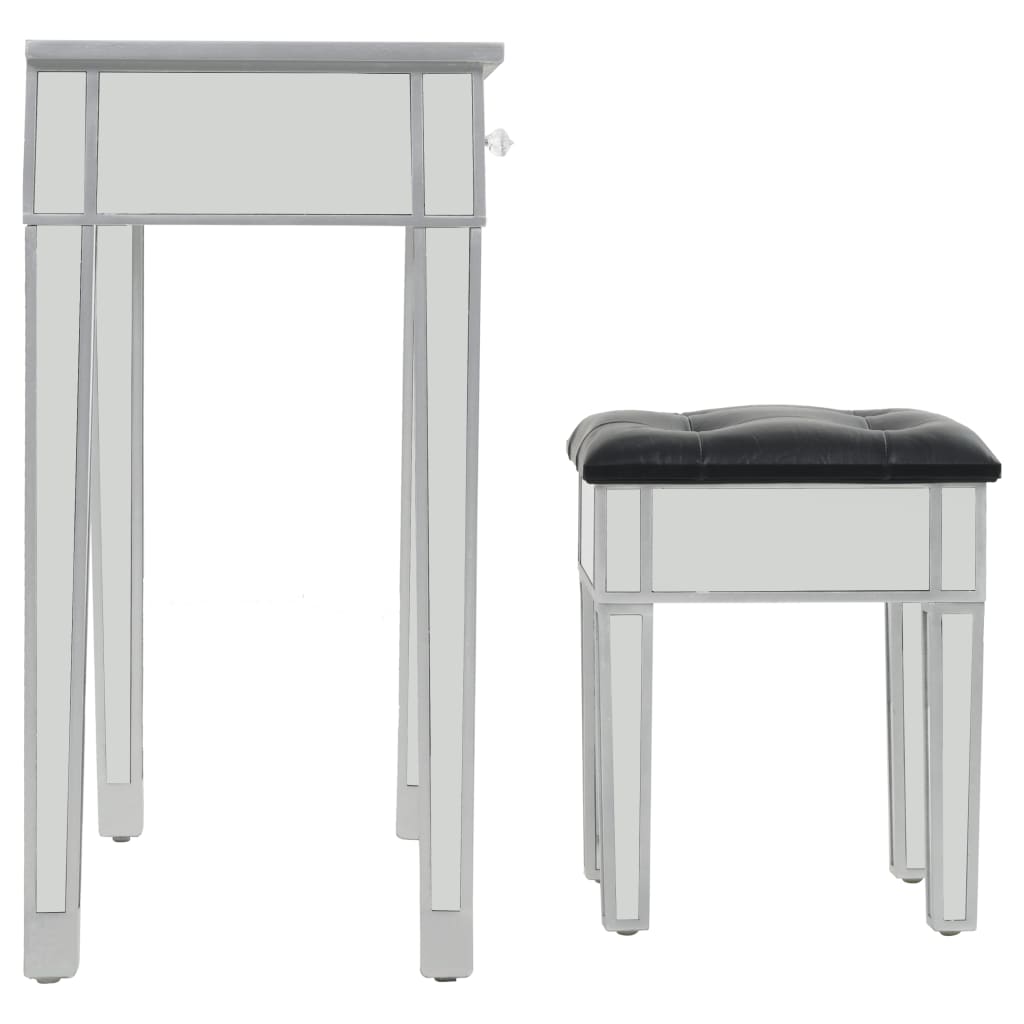 Der verspiegelte Frisiertisch und der Hocker verleihen Ihrer Einrichtung einen Hauch von Eleganz. Das Make-up-Tischset ist mit glattem Spiegelglas verziert und strahlt eine raffinierte Atmosphäre aus. Der Schminktisch und der Hocker haben einen stabilen MDF-Rahmen. Die zwei Schubladen bieten Platz für alle Arten von kleineren Gegenständen. Der Schminktisch kann auch als Konsolentisch, Flurtisch, Schreibtisch usw. verwendet werden. Dank der verspiegelten Oberfläche wertet das Tischset Ihr Interieur sofort auf und sorgt für ein geräumiges Raumgefühl. Die Faux-Kristall-Knöpfe verleihen einem eleganten Charme und erleichtern das Öffnen der Schubladen. Der Sitz ist mit Kunstleder bezogen, um höchsten Komfort zu bieten und luxuriös zu wirken. Der Tisch und der Hocker sind kinderleicht zu montieren.